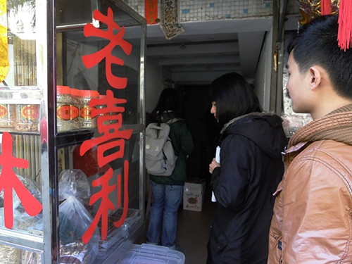老喜利的店主黄志群热情地向队员们介绍:“老喜利猪头粽已有100多年的历史,其源头要追溯到经济落后的年代,当时人们为了填饱肚子,将猪肉的肉末混合在一起熬制,制作成一种食物。”猪头粽制作的主要原料是猪头皮、猪肉,还有20多种配料,其中包括药材。肉剁碎后和配料经过熬、炒之后浇入木模中,再用石头压,使其定型。整个制作过程大概要一天。猪头粽制作完成后切小,进行抽真空包装。老喜利猪头粽的价格为40元一斤,据店主说,过节时生意较好,人们会将猪头粽作为礼物送给亲朋好友。出游时人们也经常购买,因为它便于携带。店主还说,因为这个品牌的猪头粽现在有多个厂在制作,口味不一,所以他们会在明年将品牌改名为老巴脚。待改名后,他们会考虑在网上注册网店进行销售推广。