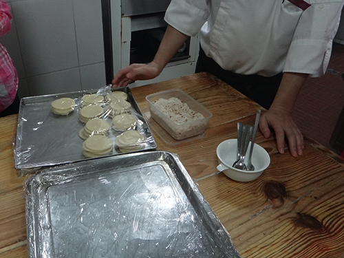 酒店忙碌的厨房里,阿清师傅在压板区为小秘们腾出一方空间介绍油角制法并且亲自示范。小秘们向阿清师傅请教制作上的一些疑问,包括油角皮的制作方法,馅料的准备,油角包制的秘诀等,阿清师傅十分耐心地为小秘们答疑。在包制油角的环节中,三位小秘按照师傅教的手法亲手包了几个油角,从第一个的惨不忍睹到后来的像模像样,小秘们感叹道:“看似那么简单的油角背后其实要求极高的技术啊!”。