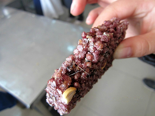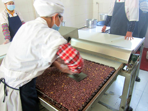 在工厂负责人带领下,调研人员经过了一个个独立间室(产品展示室,外包装间,内包装间,调味成形间)后,队友们来到了膨化室。在室内摆放着两口大黑锅,里面盛着黑乎乎的盐粒,师傅们把蒸熟晒干的糯米倒进锅,然后用锅铲快速的炒几下,很快,白白胖胖的爆米就出锅了。队友们紧随大胖爆米的脚步,进入调味成形间。里头也有两口大铁锅静候着,师傅接过一份份经严格称量的白砂糖和黄糖片,倒在滚烫油中,将糖融化。待糖中的水分蒸发后,将爆米倒进锅中,使之与糖充分混合,铲出倒进模格里,压平,然后用新引进的机器进行切割,就这样,金灿灿,方正正的米橙就诞生了。队友们禁不住诱惑,尝了下,刚出炉,热乎乎的米橙,特别香甜可口。每咬一口缕缕金色糖丝都欲连又断,队友们很是享受。之后,米橙便被送往“穿衣间”套上一件透明的大衣,等待入罐。