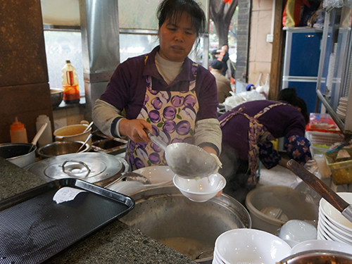 由于接近年关,泮塘路上人头攒动,而路边众多的濑粉店前更是挤满了顾客。收银台前、取餐窗前、座位上甚至是座位旁都挤满了等待美食或品尝美食的顾客。濑粉店的员工都非常忙碌,小队成员不好意思上前采访,便点上一份濑粉慢慢品尝,等到该店员工有空闲时间再上前采访。