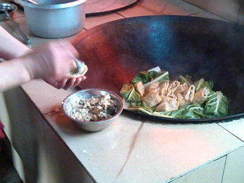 村民对队员们的到来显得非常热情,听完队员们的介绍,便着手准备制作莙荙包的原料。莙荙包的原料主要有莙荙菜和萝卜、冬笋等组成馅料的各种食材,可按个人口味不同,馅料也可灵活变通。大娘娴熟地将萝卜、冬笋、香芋等食材切成丁,加入食盐和油拌匀,炒至半熟代用。包莙荙包看起来很容易,跟包云吞的步骤差不多。可是,到了队员们的手里却硬是不能成型,和大娘的比起来不整齐也不饱满。不一会儿,队员们和大娘合作完成的莙荙包便包好了。煎好的莙荙包色泽淡绿,清香扑鼻,打开来更是让人垂涎三尺。