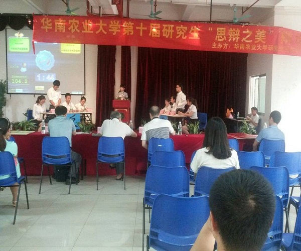 2014年4月12日下午2:30,由华南农业大学团委研究生会主办的第十届研究生“思辨之美”活动在研究生活动中心二楼顺利举行,此次比赛分为初赛、复赛、半决赛、决赛四个阶段进行。本次比赛特邀来自人文与法学院、动科院、经管学院的三位老师担任评委,比赛双方的辩手分别是来自园艺与食品学院,并以“民族技艺是否应该保密”为辩题展开激烈的辩论。