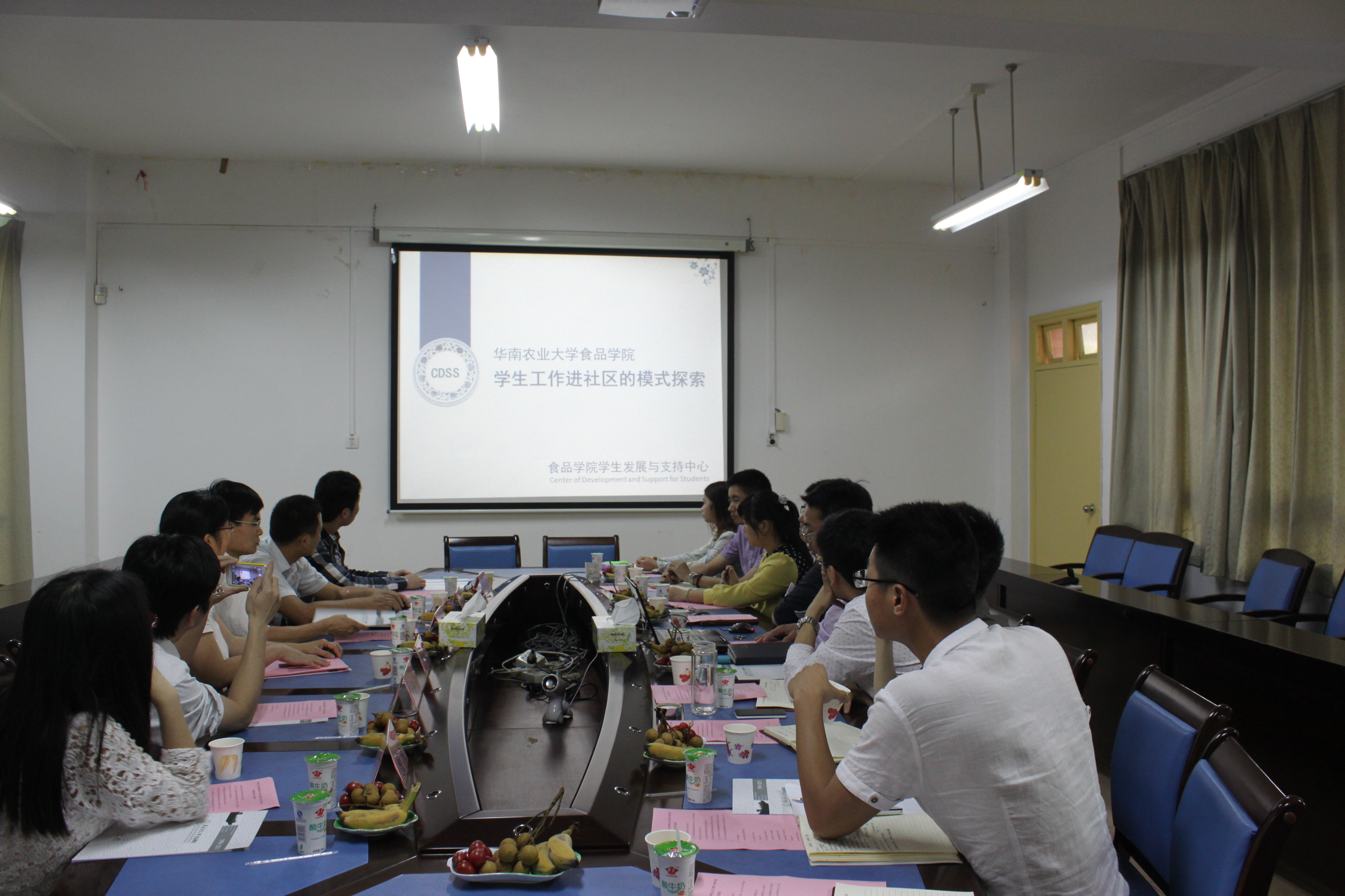 座谈会上,苏镇松副书记对英建文副书记、周东斌副书记一行的来访表示热烈的欢迎,重点介绍了我校学生工作进社区的情况与取得的效果,并就食品学院社区工作的开展进行经验分享。2011年5月,食品学院尝试将学生成长发展理论与社会工作的理念和方法运用到高校学生管理和服务工作中,成功创办学生发展与支持中心(CDSS),成为华南农业大学首个提供学生发展与支持服务的社区机构。三年来,经过不断的创新与探索,食品学院在社区机构设置、硬件设施、服务内容、制度建设与工作机制方面日益完善,形成科学的理论支持,建立学生、社区、服务协同发展的长效机制。随着学校领导对社区工作的重视与推进,学校于2013年设立了校级社区服务平台。目前食品学院设有学生事务办公室、社区党员服务站、职业指导室、心理辅导室、同辈辅导室、辅导员休息室等功能室,全方位为学生提供成长辅导、党务问询、职业指导、心理咨询、学业引导及学生活动场地借用等服务,依托各功能室成功打造“启林成长沙龙”、“我和老师有个约会”、“支书论坛”、“社区团校”、“时间银行”、“社区精英培训计划”、“社区文化节”、“爱心中转站”等精品项目,为学生成长成才提供贴心、周到的服务。