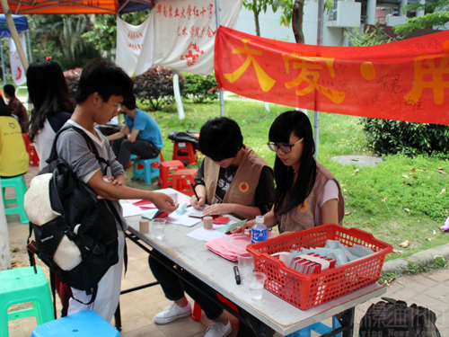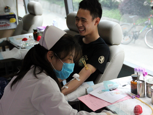 记者看到在献血车上等候献血的人很多,他们看起来很紧张,但是眼神中透露出一种坚定。红会工作人员细心地为献血学生准备了糖水。对于部分由于身体原因不能献血的同学,受访的一位红会干事称,很高兴大家都能有这份爱心。他告诉记者,根据2012年的《献血者健康检查要求》规定,年满18周岁低于55周岁的健康人群均可自愿献血,同时男生体重要超过50千克,女生应低于45千克,近视人群的近视度数不可超过600度。
