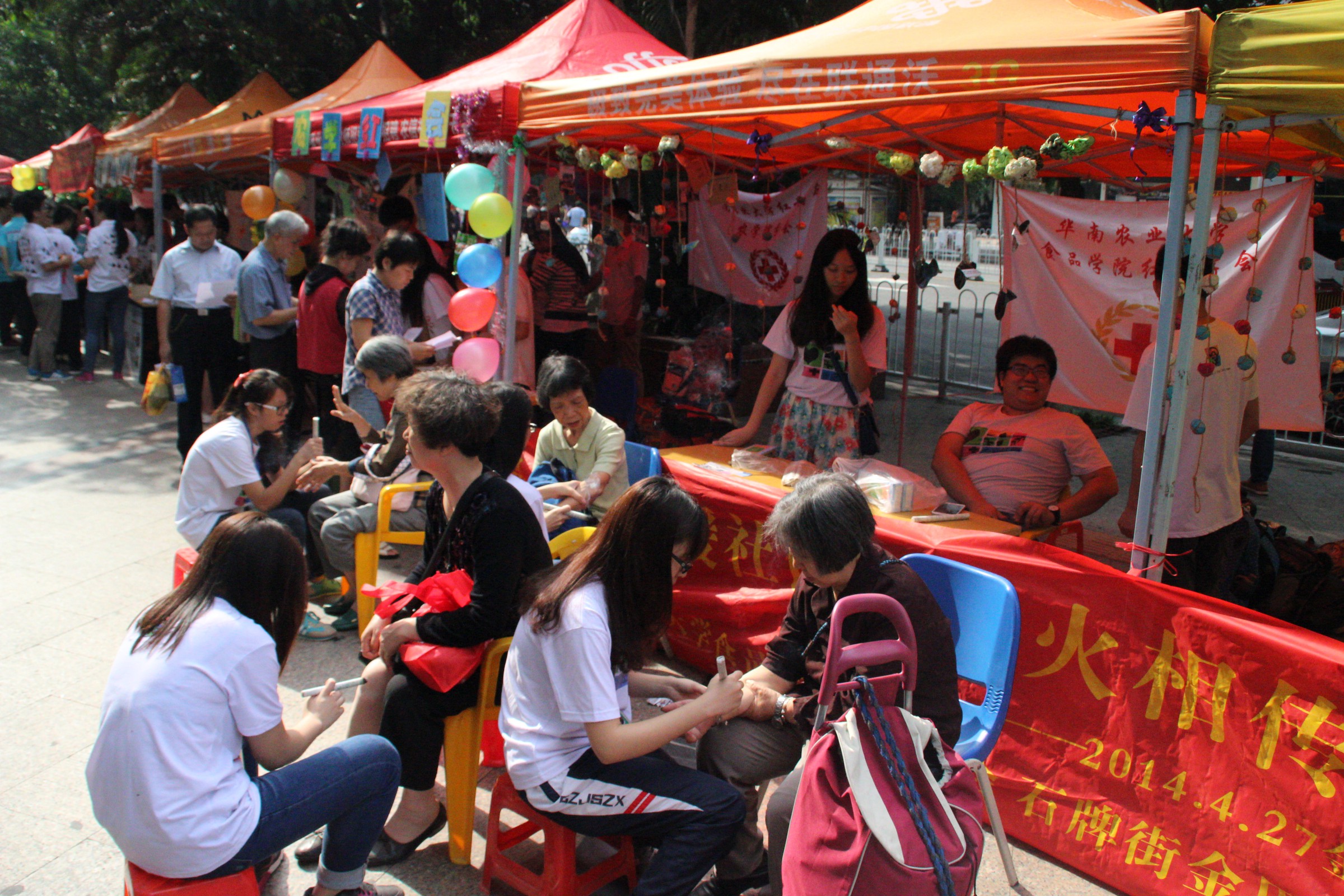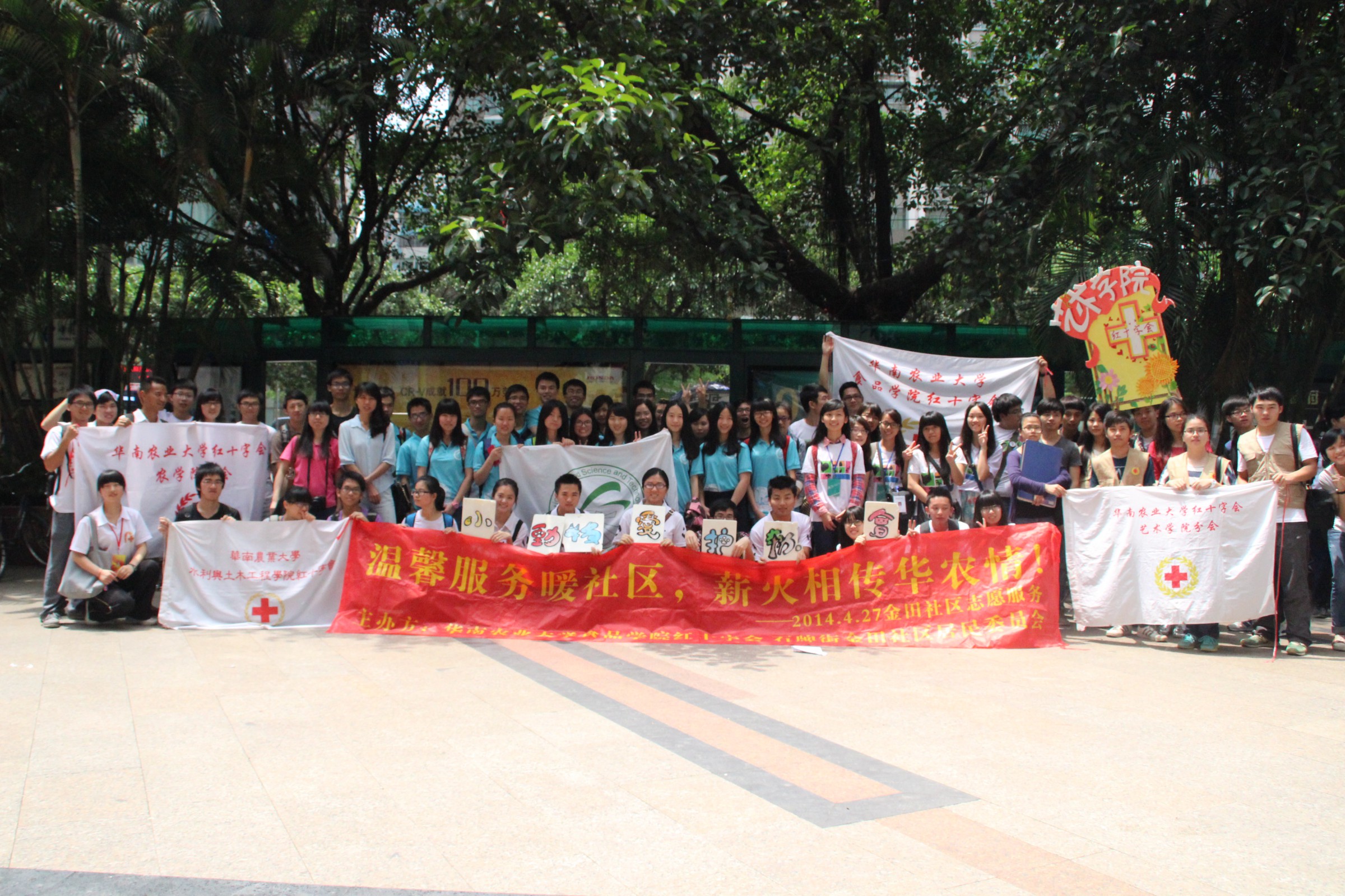 4月27日上午,食品学院红十字会(以下简称食品红会)联合我校小动物爱护协会、保健养生协会、食品学院食品科技联合会、艺术学院红十字会、农学院红十字会、水利与土木工程学院红十字会在龙口西社区开展以“温馨服务暖社区,薪火相传华农情”为主题的大型社区服务活动。本次活动由天河区人民政府石牌街道办事处、天河区金田小区居民委员会、华南农业大学食品学院红十字会联合主办。