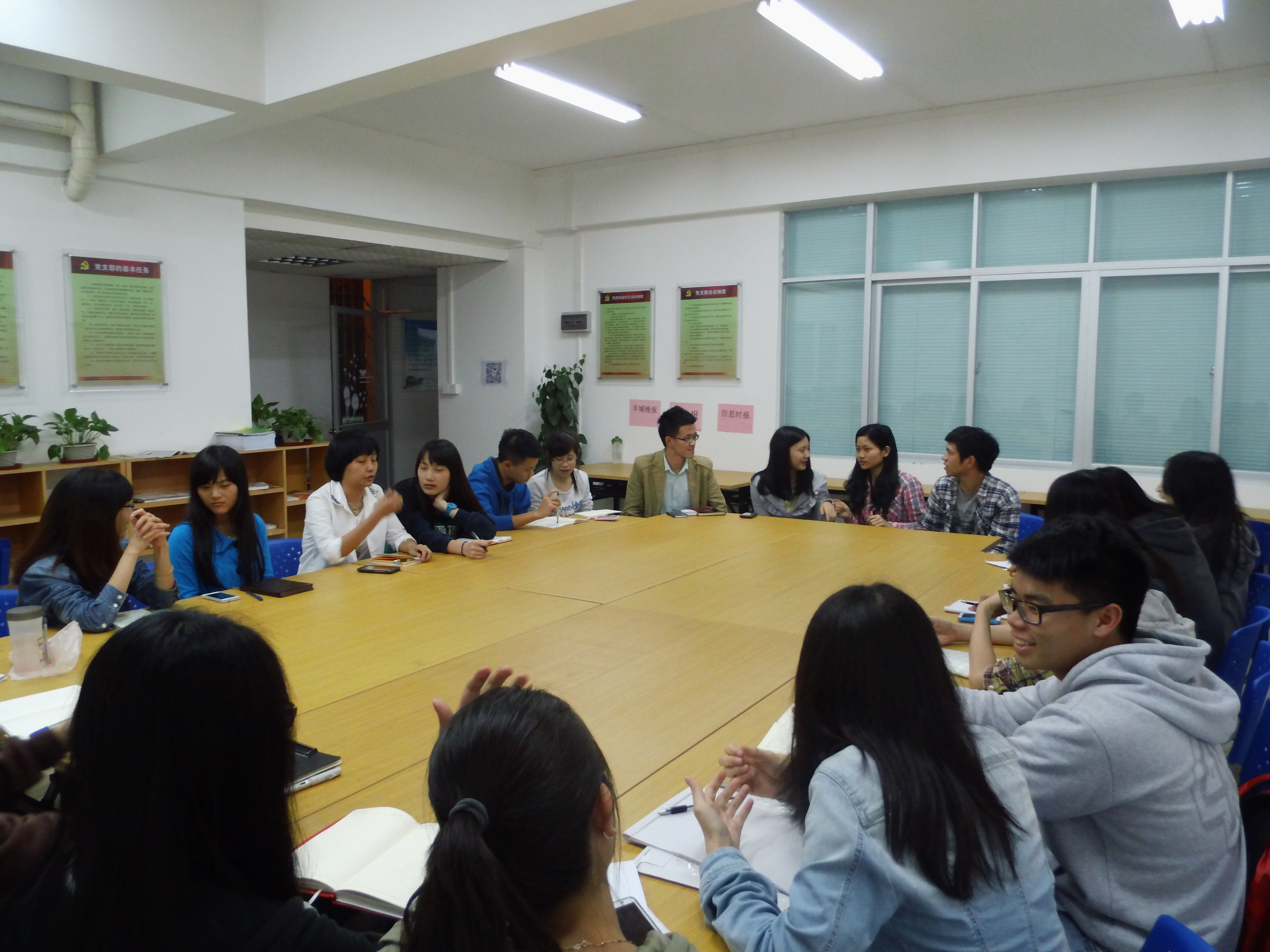 交流会就新生助班应如何选择并与阳光员搭档、如何与班主任和新生辅导员更好地进行工作沟通和自由提问三个环节展开交流。关于如何选择合适的阳光员搭档,聂天慧师姐提到,最好选择与自己性格互补的阳光员搭档,方便新生班级工作的顺利开展。关于如何与班主任和新生辅导员更好地进行工作沟通,李世坚师兄提到,可以在第一个学期养成定期向新生班主任汇报新生班级最新情况的习惯,以便班主任对所带新生班级的深入了解;同时,林晓慧师姐提到,作为助班,应积极与新生辅导员进行班级情况的沟通与反馈,以便及时发现问题和解决问题。在自由提问环节,18位14级助班也积极发言,表现踊跃,对自己接下来助班工作中可能遇到的问题都及时向辅导员和3位助班嘉宾提出,并得到了较为满意的回答。整个交流会现场呈现出积极交流的氛围。