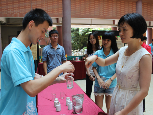 活动现场划分为五个区。“食品标签区”陈列着各种食物的包装袋及多样的食品添加剂,展示一些食品标签鉴别的技巧和需注意的标签内容。“食品鉴伪区”提供各类小方法用来鉴别酱油、蜂蜜、酸奶的好坏。丰富有趣的游戏在“游戏区”,旨在让小朋友在游戏中得到知识。“趣味实验区”由工作人员演示实验并向小朋友们阐述实验的原理。“自由实验区”鼓励小朋友与家长在听完工作人员讲解后自己动手做实验,体验其中的奥妙。