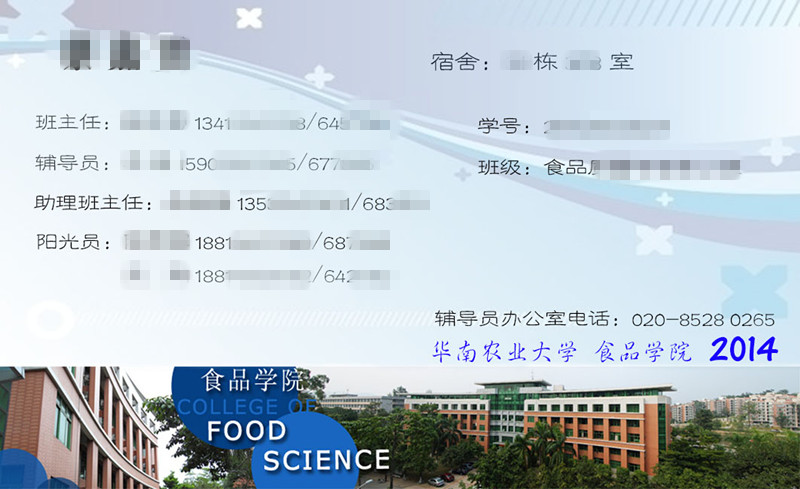 沿袭传统,食品学院今年依旧为每位新生特别设计了“新生名片”,将在迎新当天分别发放给新生及新生家长,名片上有新生的班级、班主任、助班、阳光员、寝室号等信息,力求在最短的时间内消除新生的不适感,促进家长和学校的有效沟通。一张小小的名片,也许能在关键时刻解决关键问题,食品学院旨在从细节入手,做新生的贴心知己。