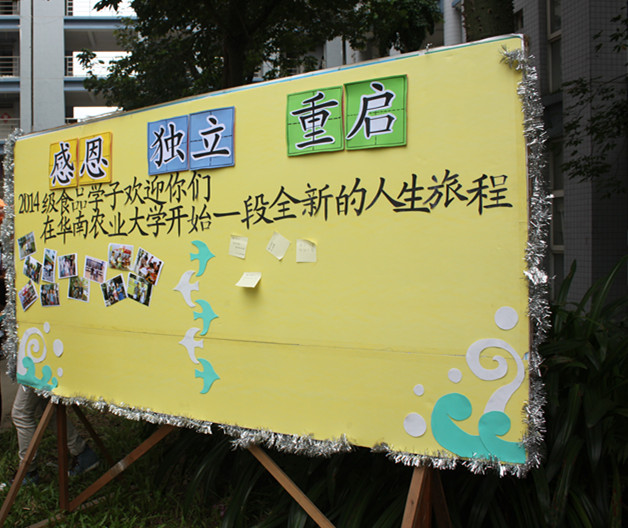 今年食品学院迎新活动的主题是感恩、独立、重启,为了让新生懂得感恩帮助过自己的人,学院特意在注册处设置了一个感恩墙,上面贴上新生到来时和家人、朋友、师兄师姐们的合照,让他们知道有很多人帮助自己,旁边空白处可以让他们写上感恩的话语。