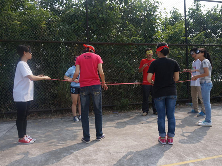 “衔杯传水”是户外培训的第二项内容,各个组员必须在规定时间内用嘴衔着纸杯将水传递下去,过程中不可用手。用时最短的小组仅花费了2分30秒,而用时最长的小组时间接近6分钟。“蒙眼做矩形”需要组员们蒙上双眼,用一根长绳摆成一个大矩形。期间各个小组的组员讨论激烈,各显所长,每个小组都成功地摆出了一个矩形,而耗时最短的小组可以获得额外的零食奖励。