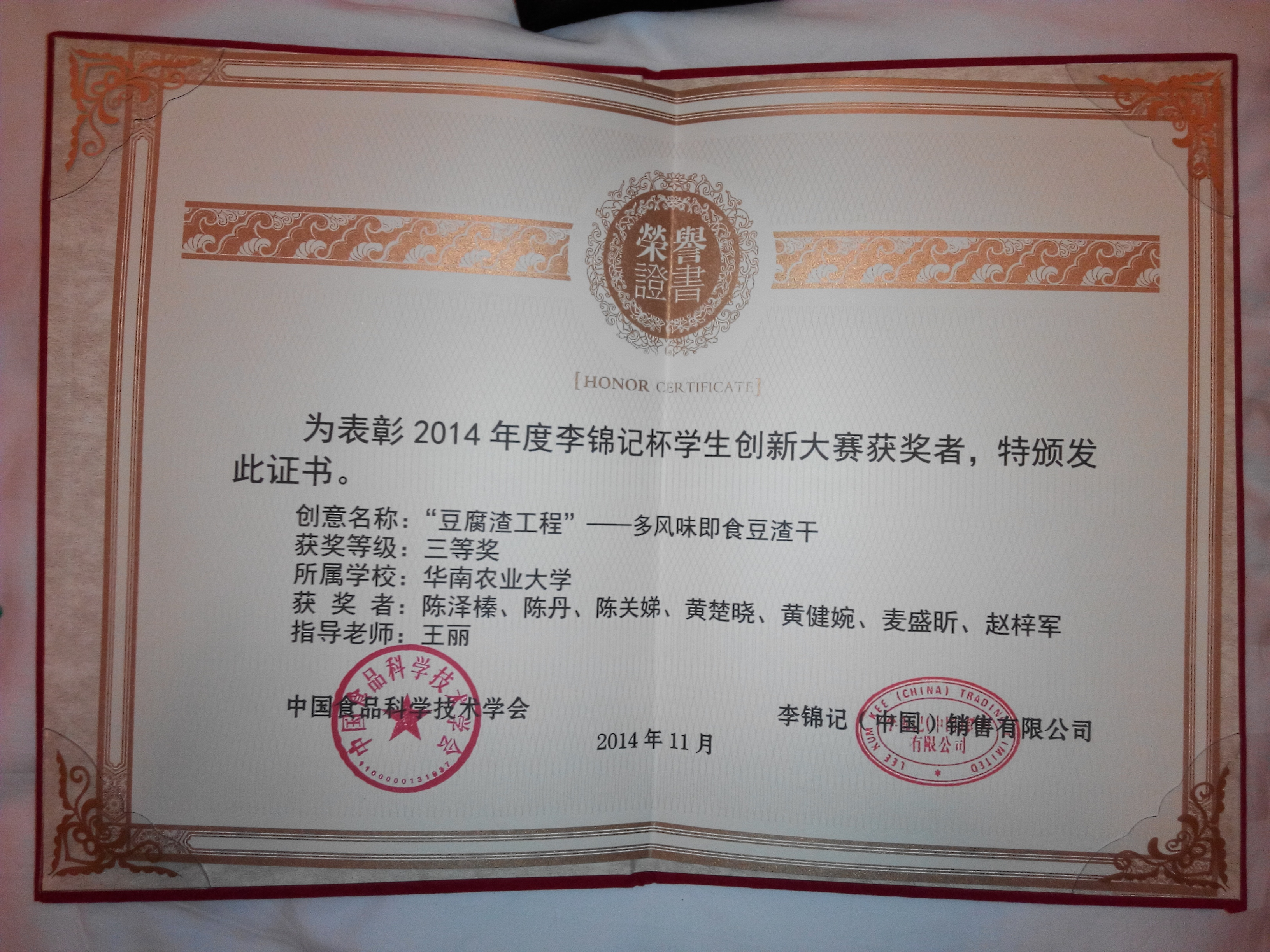 据悉,2014年李锦记杯学生创新大赛由中国食品科学技术学会、李锦记(中国)销售有限公司共同主办,全国参赛队伍数百,由专家组根据创新性及市场定位、产品配方合理性、加工方法可行性、用法及用量、产品商业化可能性等标准对每份计划书评分,筛选出40份入围计划书。最终评出一等奖1个,二等奖2个,三等奖5个,优秀奖5个、单项奖5个(最佳创意奖、最佳工艺奖、最佳风味奖、最佳包装奖、最佳视频奖),优秀组织奖1个。