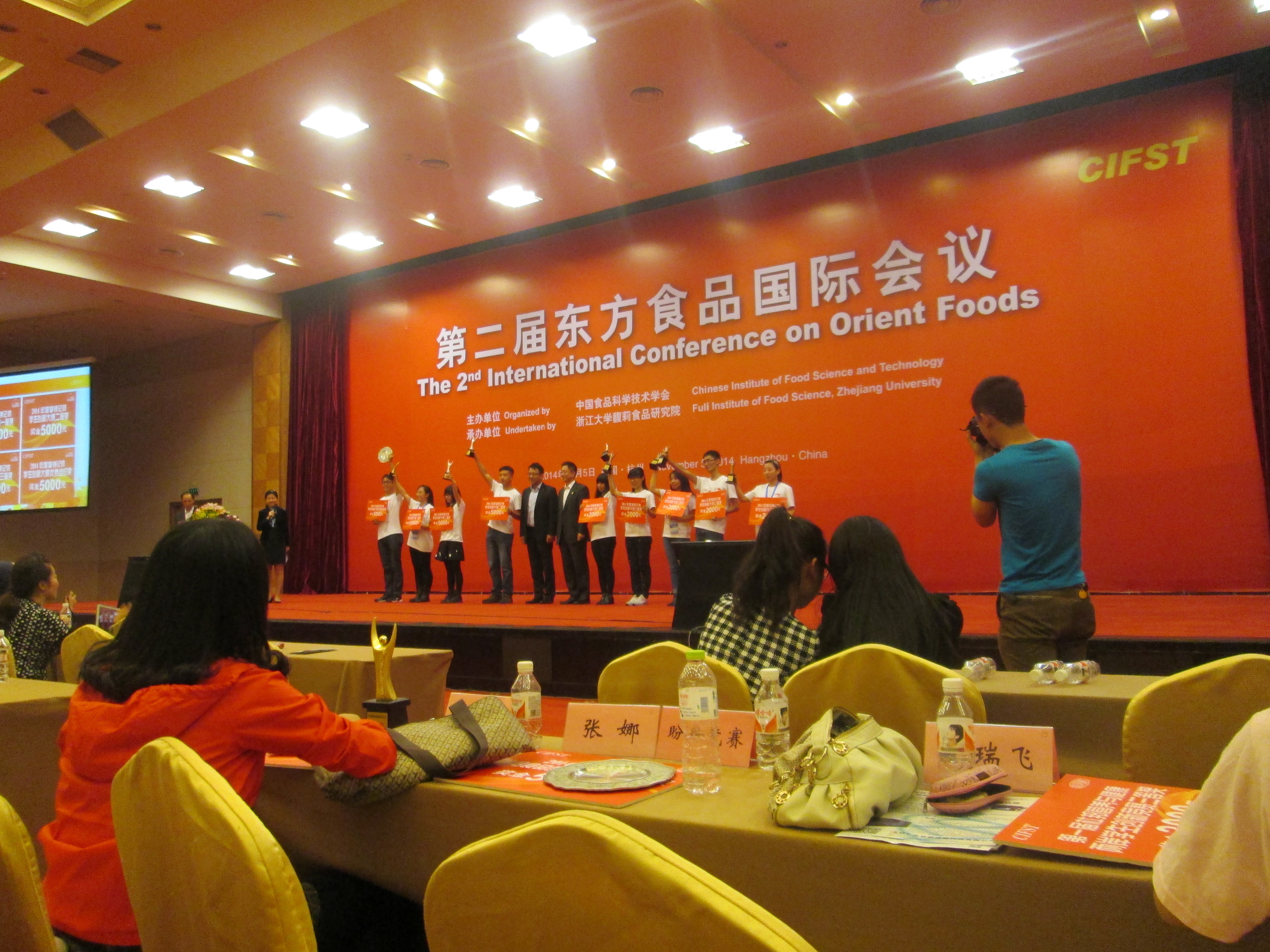 11月4日至6日, 中国食品科学技术学会第十一届年会在杭州举行,来自全国的数十所高校食品专业师生参加。学会表彰了2014年度“杜邦杯”、“李锦记杯”、“康师傅杯”三大学生创新大赛共25项获奖项目,我院王丽老师指导的《“豆腐渣工程”——多风味即食豆渣干》喜获“李锦记杯学生创新大赛”全国三等奖,参赛学生陈泽榛作为代表上台领奖。