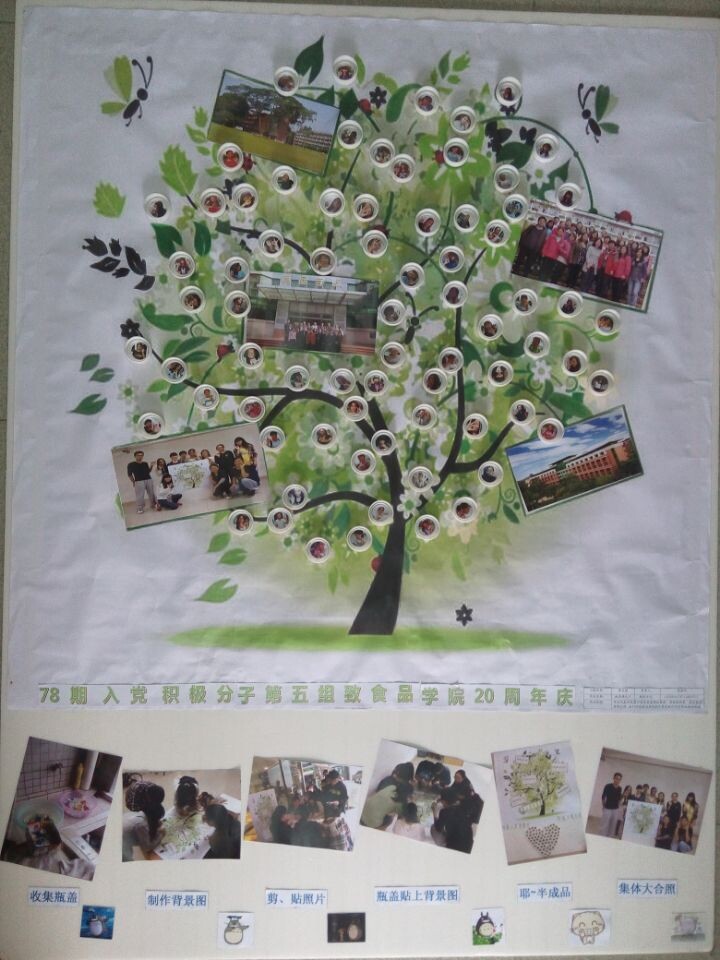 党校入党积极分子分为十二个小组,轮流上台展示他们精心制作的手工艺品。第二小组的作品名为“党在院心”,运用了投影仪的光学原理,将党徽投影在食品院楼状的箱子底部,象征着食品人在党的带领下奋勇前行,开创未来。巧妙的构思让在场的观众们赞叹不已。而第五小组带来的则是一幅“桃李满天下”手工画,枝繁叶茂的大树上结满用塑料瓶盖做的果实瓶盖里嵌入许多笑脸,学员们借此来表达对学院老师的感恩之情。第十小组的 “雕刻食光”院史更是博得了阵阵掌声,该小组采用纸雕技术记录院史,庆贺院庆,美观同时不失环保。第十二组的作品“院庆‘筷’乐”用一次性筷子做成,兼具环保与内涵,由两个人脸和党徽构成一面党旗,党旗下方有着“食为天,人为本,创为魂”九字的食品学院院训。其他小组的“二十年学士情·酸甜与共”超大酸奶盒、“食心食意”书架等作品也赢得在场观众声声喝彩。