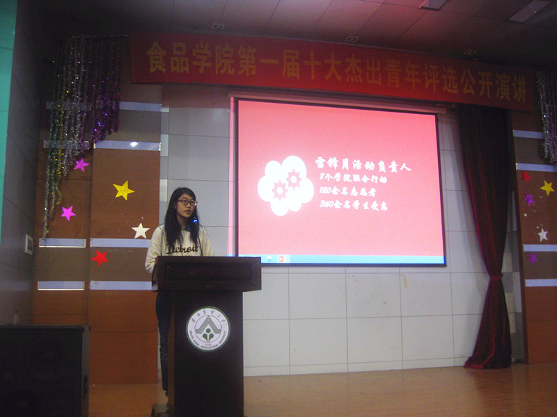 参与本次评选公开演讲大会的一共有来自食品学院各个年级各个专业的31位候选人。分别竞选“学习标兵”、“食品之星”、“公益天使”、“文体之星”、“领袖模范”等八个称号。每一个演讲者各有4分钟演讲时间展示自己,在场的每一位观众手上都有一张投票卷,凭此选出他们心目中的十大杰出青年。