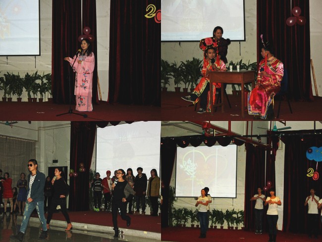 青春无限、激情四溢的开场鼓舞《barbarbar&uhee》拉开了整场晚会的序幕,点燃了在场全体观众的激情。由硕士1班演唱的《老男孩》让大家又回到了青春烂漫、意气风发的青春时代,重温那段激情燃烧的岁月。小品《新闻乱播》以夸张搞笑的动作和诙谐调侃的语言令在场观众捧腹不已。苗族舞《红苗伞》尽显我院学生的多才多艺,在悠扬的琴声中,红苗伞下的幽靥之舞宛如旭日东升的朝阳,霞光四射,染红了整个舞台。手语表演《爱,因为在心中》、T台秀、话剧《我们这些浮萍》《甄嬛传》、京剧《锁麟囊.春秋亭选段》、歌曲《和你一样》等一个个精彩纷呈的节目,使整个晚会高潮迭起,晚会的喜庆气氛被歌声、掌声、喝彩声烘托得淋漓尽致。