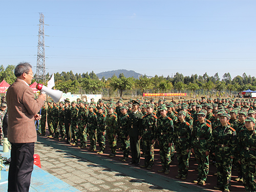 教导员李迪老师向领导介绍了军训帐篷和后勤队,院长感慨:“后勤的同学不容易啊。”有模有样的军营也让孙院长回忆起自己的军训,农村出身的院长改革开放以后才得到上大学的机会,从小的军训经历磨练了他的意志。他发言时表示:“军训是一次好的经历,磨砺意志能保持一辈子。希望大家能‘食苦耐劳磨练意志,品尝汗泪再换新颜’。”他表扬了新生的军训面貌并表达了自己对大家的殷切问候和祝福。(图/蔡楷强 莫汉豪 文/陈思慧)