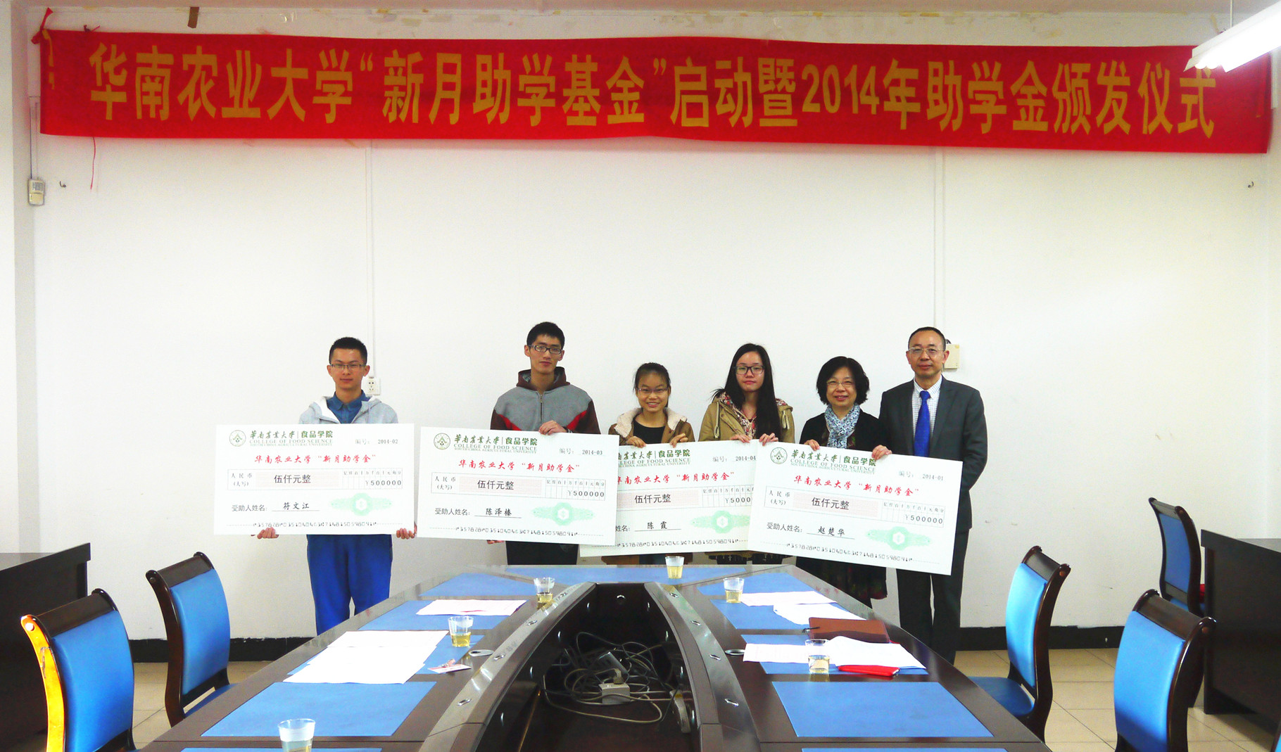 2015年1月16日,华南农业大学“新月助学基金”启动暨2014年助学金颁发仪式在食品学院301会议室隆重举行。基金捐赠人宁水生、吴青夫妇,食品学院党委书记秦亮生、食品学院党委副书记鲍金勇及受助学生出席了仪式。