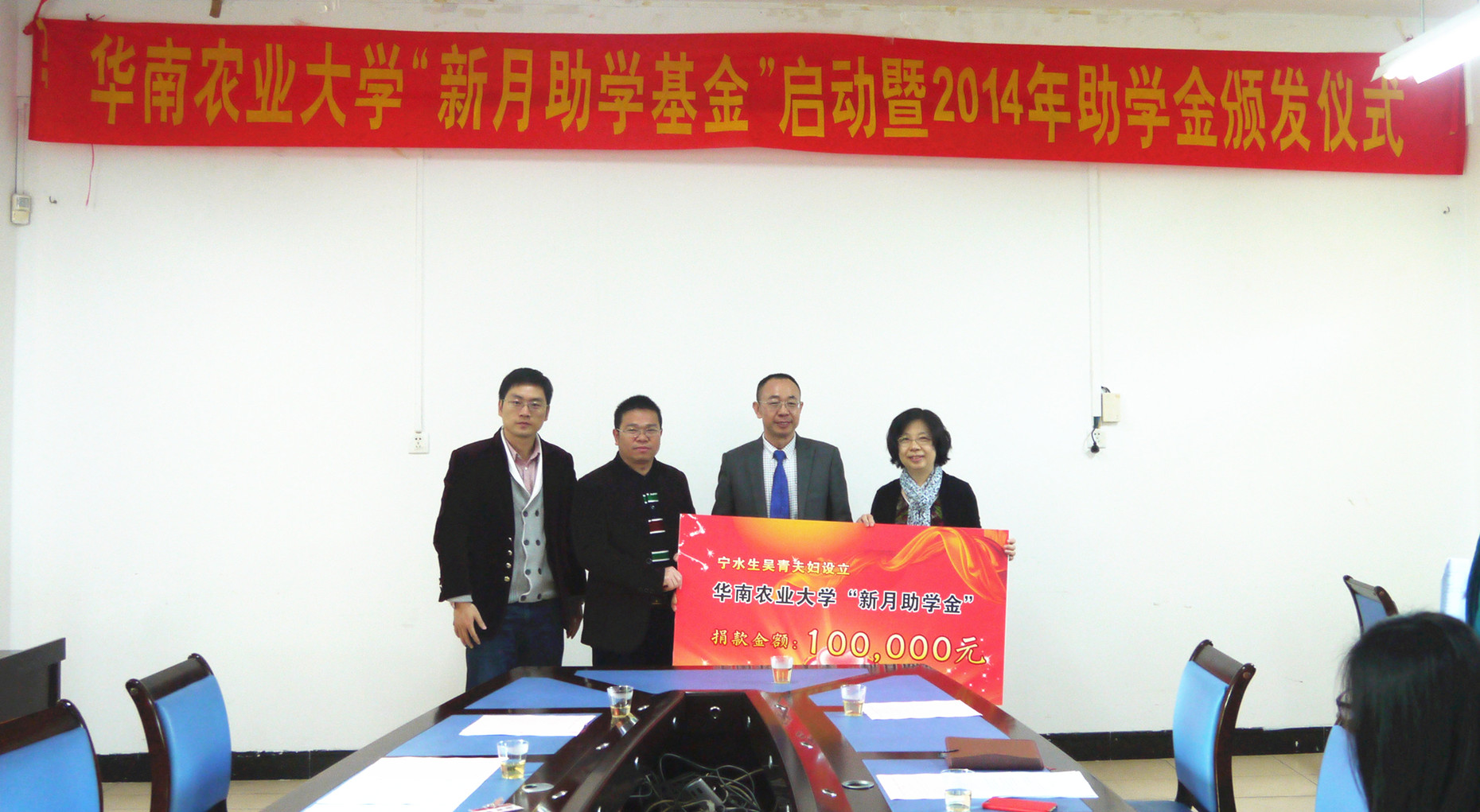 耀眼的冬日点燃求学的征程,浓浓的爱心带来腾飞的希望。广东九极生物科技有限公司总裁,资深直销管理专家,世界直销(中国)研究中心专家委员,宁水生先生及其夫人,食品学院资深教授,曾获学校教书育人奖,获国家教学成果二等奖和省级教学成果一等奖,深受学生喜爱的吴青老师,为促进华南农业大学教育事业的发展,更好地鼓励华南农业大学食品学院家庭经济困难的学生勤奋学习、努力进取,在学业、创新创业、志愿服务等多方面全面发展,共同出资设立“华南农业大学新月助学基金”,捐赠总金额达拾万元,每年捐赠人民币贰元,用于资助4名华南农业大学全日制在校家庭经济困难的优秀本科生,每人一次性发放人民币伍仟元。