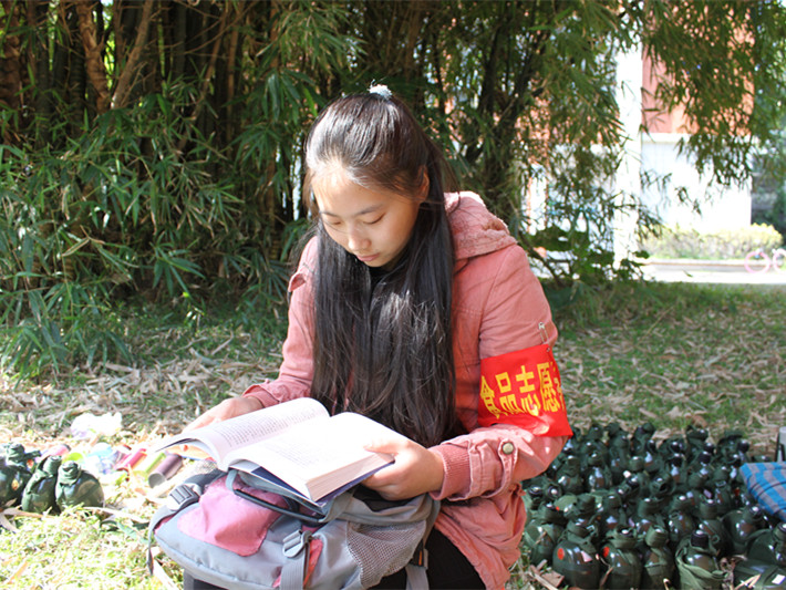在志愿服务现场,记者看到,预备党员马瑞婷正小心翼翼地为学员涂消毒的双氧水,这名学院在匍匐前进中不小心受伤。在学员离开之后,马瑞婷拿起旁边的《战争与和平》,继续阅读。马瑞婷笑着说:“在帐篷值班空闲时就会看书。”在和记者聊天时,恰逢学员们的休息时间,马瑞婷又放下书本去为学员们倒姜茶。她说:“看着新生就像看着去年的自己,今年自己成为预党,希望能为新生们尽一点力。”