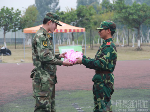 每个排都为自己的教官准备了礼物,最心底的话、最难忘的场景,信与相册是送给教官最好的礼物。“我把我写的小段子都抄在明信片上,还让我的同学画上漫画,这样送给教官。”八排的黄润莹说。三排丁教官收到的礼物被精美的包装纸包裹着,“快点拆开吧!”“不能拆开,要保持神秘。”三排的女生围着丁教官红着眼睛起哄着。“让我们红尘作伴,活得潇潇洒洒……”十排的男生女生红着眼睛把歌唱了一遍又一遍,不少女生唱到哽咽,低头用纸巾擦擦眼泪,重新开口唱着。学生红着眼眶唱着歌,教官低头细心倾听。