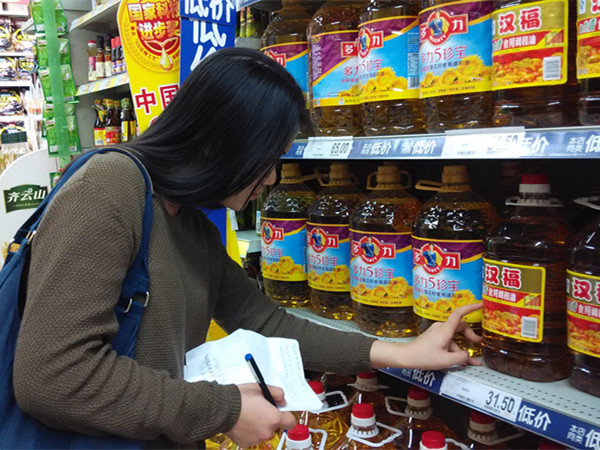 抵达岗顶华润万家超市后,小探队迅速找到了食用油专区,展开了对不同品牌、品种的食用油标识的记录。货架上,有金龙鱼、多力、金鼎等品牌,主要包括有玉米油、大豆油、花生油、葵花籽油及调和油等油类。下午,小探队再次踏上征途,前往下一站越秀区家乐福超市,对汉福金龙鱼、新湖、豫沙、西部、胡姬花、红灯、元宝等品牌食用油进行了调查,此外还对黄豆酱、番茄酱,酱油等做了讨论。