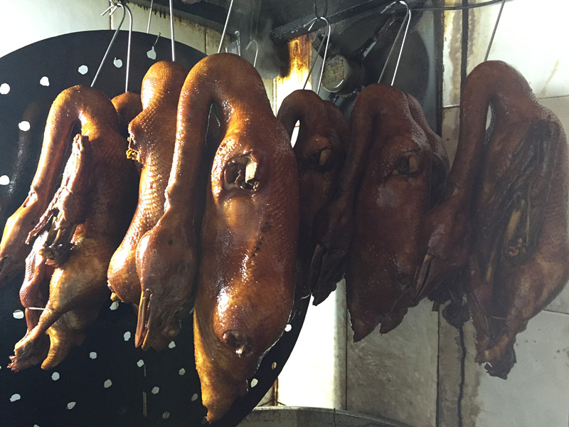 早上,队员们跟随店主采购了二十只狮头鹅。经过细致拔毛和清洗的工序后,肥实的鹅被分批浸入配制好的汤料中进行卤煮。师傅一般会通过观察肉质、表皮颜色来掌控卤制的时间,卤制完毕后晾干售卖。调研发现:卤制过程中最重要的步骤就是严格控制卤香入味的工艺——既要保证鹅肉的鲜味不被卤汁的咸味完全覆盖,又要确保卤味的香气渗透到鹅肉中。其恰到好处的控制工艺需要老师傅在长期的实践中反复摸索,这也从侧面反映了每只味美肉鲜的卤鹅着实来之不易。而队员慧婷在采访中发现,不同店家制作的卤鹅味道存在差异,除了与鹅的饲养时间有关,更重要的原因是卤汁配方的不同及卤煮火候的掌控。
