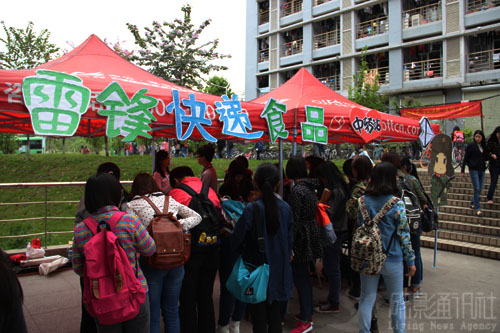 “雷锋快递员”也出现在荷园门口。现场不少同学向记者反映,快件领取一直是他们深爱并痛恨的一件事情,还笑称“珍爱生命,远离三通一达”,所以团学设置的“雷锋快递员”真的给他们带来很大的帮助。