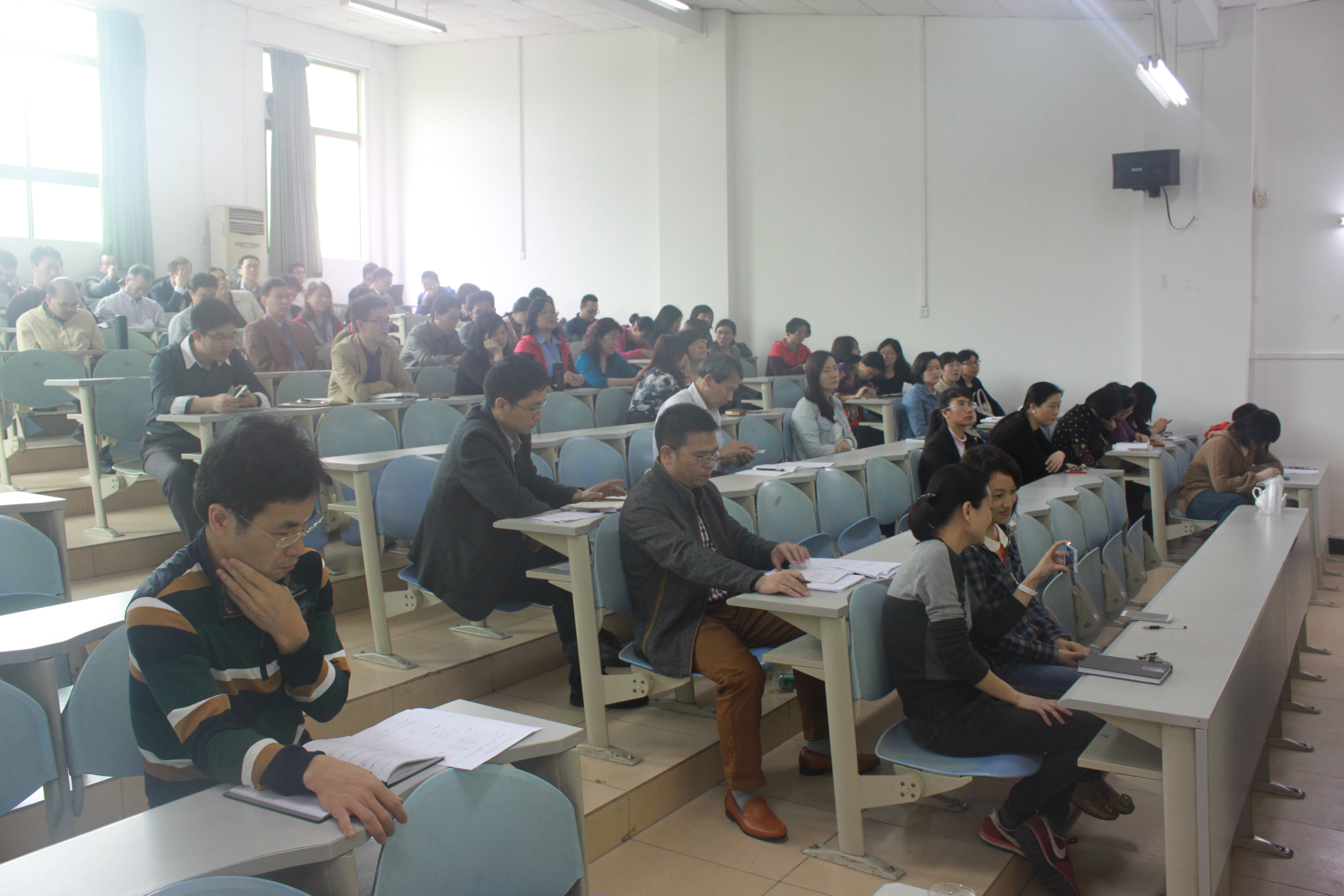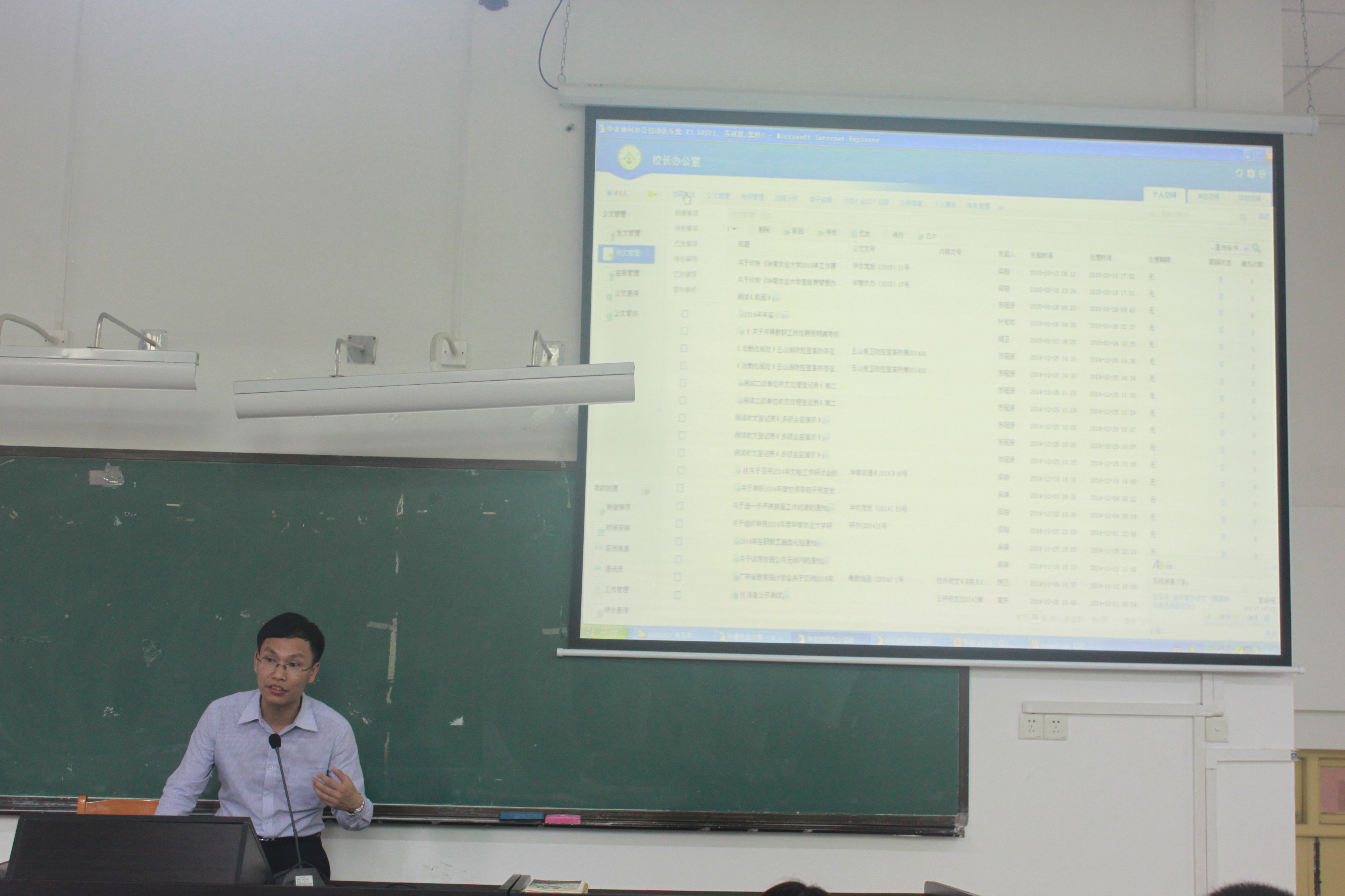首先,校长办公室秘书科苏冠贤老师分别从OA系统常用功能介绍、OA系统试运行成效、OA系统下一步计划等方面讲解了OA办公系统的功能、工作流程、具体操作方法及展望,并对大家在使用过程中遇到的各种问题进行了详细解答。参加培训的教职工认真听讲,详细记录,以便最大限度吸收培训内容。