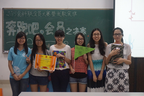最后,经过工作人员的统计核对,“让朕想一想”队以最高分获得本次会员大赛的一等奖,“601一品煲”和“肥田田队”获得二等奖,“安尼克”、“没有名字怪我咯”和“咚锵四人行” 获得三等奖,“波凹嘚喂”、“方包超人”、“联赢队”和“棒棒哒”获得优胜奖。食科联三位会长分别为获奖队伍颁发奖状和奖品,并与队伍进行合影留念。
