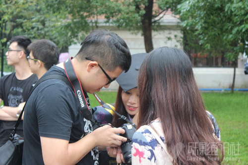 5月16日6点30分广州在下雨,期间有过停雨,8点40分天再降大雨,这时,食品学院2015届毕业生完成了行政楼前集体照的拍摄,正前往校史馆拍摄班级照。