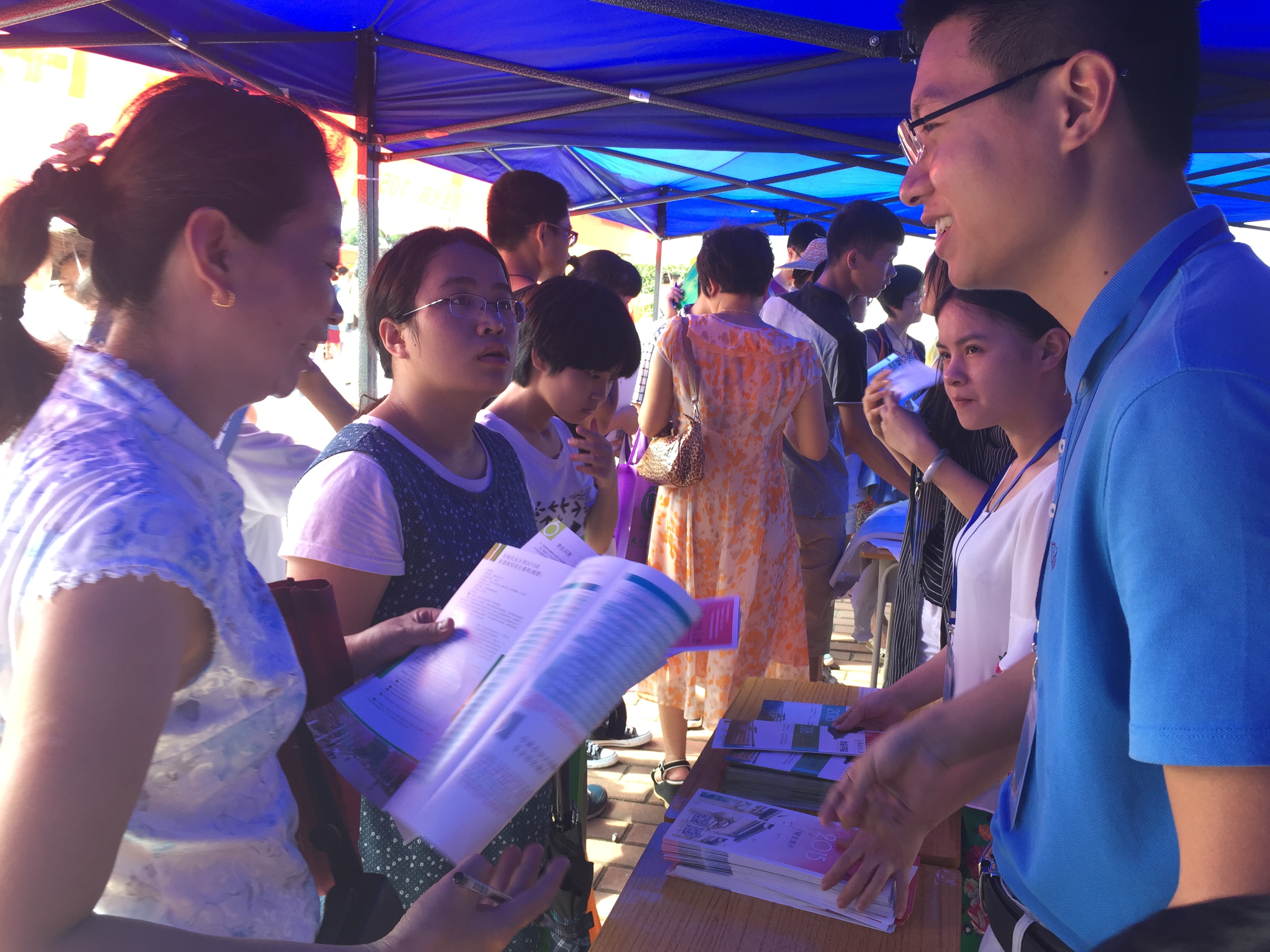 六月骄阳似火,咨询会现场火爆。早上8点,会场陆陆续续迎来前来咨询的考生及家长。我校咨询点深受欢迎,短短3小时就迎来上千人次咨询,2000多份招生资料很快派发完毕。在众多咨询中,我校历年考试录取线广受关注,有不少考生表示对我校慕名已久,但在专业选择方面比较困惑,工作人员针对不同咨询者提出的不同问题,再结合考生自身兴趣、能力、就业规划等情况为其进行耐心细致的解答。