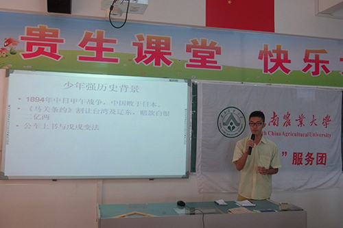 725日上午,华南农业大学食品学院三下乡队伍“阳光党行”于湛江市徐闻迈陈中学图书馆成功举行“少年强与中国梦”的学生宣讲会。迈陈中学参加支教的学生及“阳光党行”全体队员参与了宣讲会。
