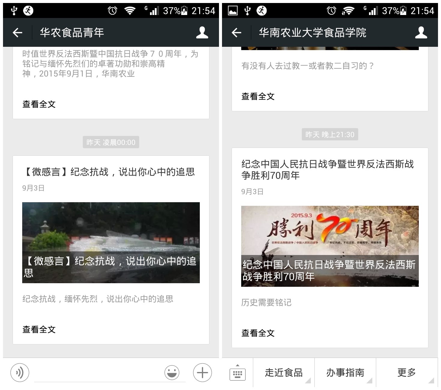 据悉,食品学院还通过线上的“纪念抗战微感言”和抗战绘画作品展等网络互动和宣传形式纪念中国人民抗日战争暨世界反法西斯战争胜利70周年,并将组织学生党支部党员和各学生团支部围绕“抗战胜利70周年”为主题开展爱国主义影片观看和践行团组织生活,力求通过多样的形式让食品学院的同学们铭记革命历史、珍惜和平时代,进而为祖国的繁荣昌盛发展努力奉献出自己的一份力量。