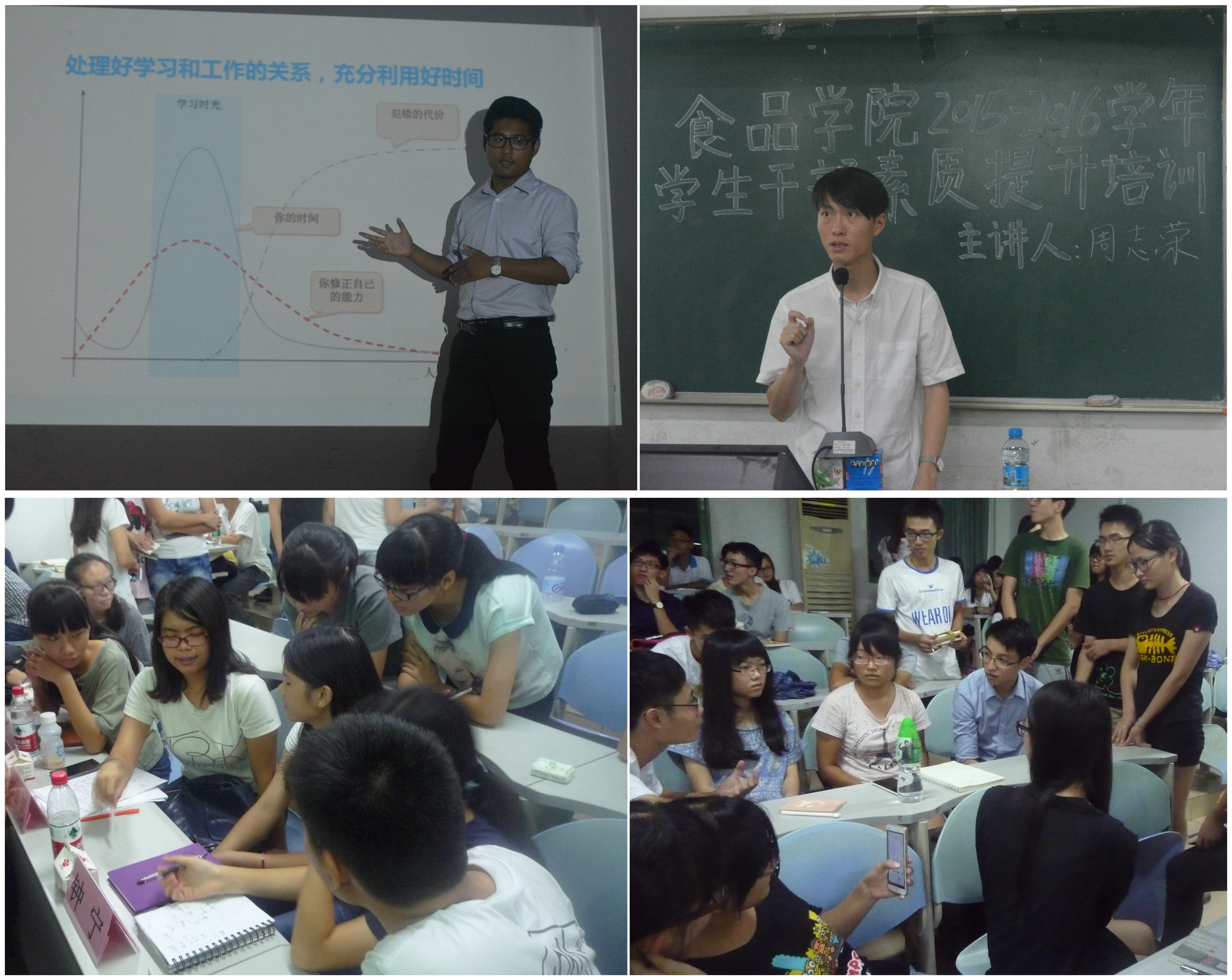 2015年8月30日-9月4日,食品学院在新学年开学初围绕“学生干部意识”、“学生干部领导力”、“学生干部礼仪培训”、“校园文化建设”“学生工作新闻宣传及新媒体使用”、“认识学生组织经费管理办法”等主题,邀请来自不同部处、学院的老师们以及已毕业的过往优秀学生干部为学院主要学生干部组织开展了学生干部素质提升培训。
