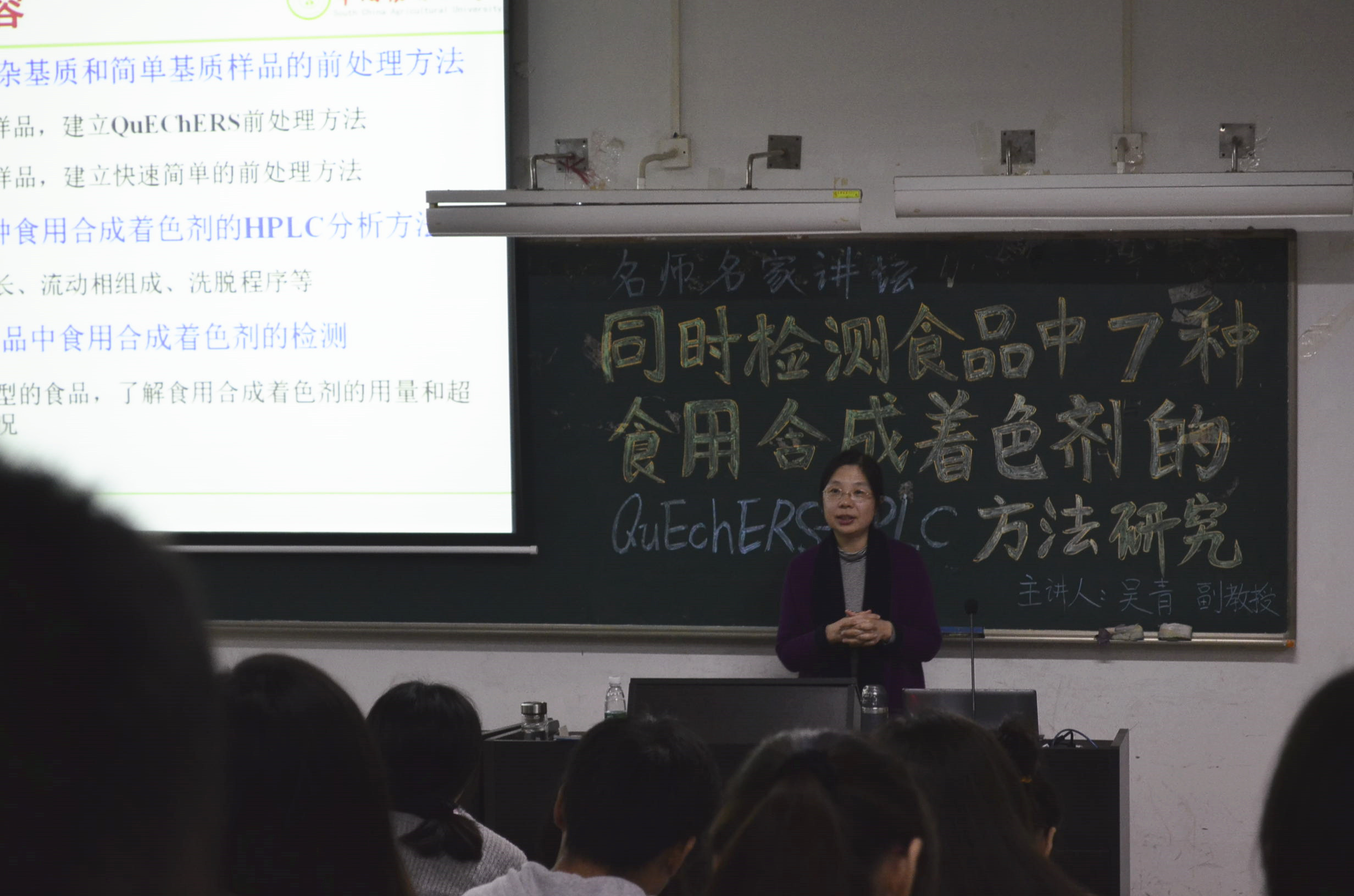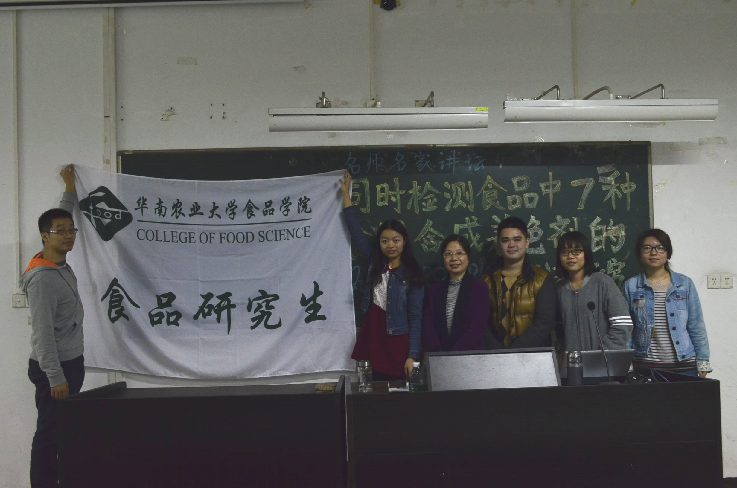 吴青教授给学生作报告 本次讲座的主题是“同时检测食品中7种食用合成着色剂的QuECHERS-HPLC方法研究”。吴青老师从研究背景、研究思路、研究内容和研究结果等四个方面进行了介绍,重点讲解了7种食品合成着色剂种类(柠檬黄、胭脂红、日落黄等)的使用现状和危害,并在前处理方法方面对QuECHERS方法和国标方法进行了比较。 集体留影 此次讲座,拓宽了广大研究生在食品安全检测方面的视野,帮助在场学者清晰的了解到了目前食品中合成着色剂测定存在的一些问题。讲座在最后的活跃的提问环节中画上句点。 (图/文 食品学院团总支宣传部陈希苗/陈希苗刘运花 )