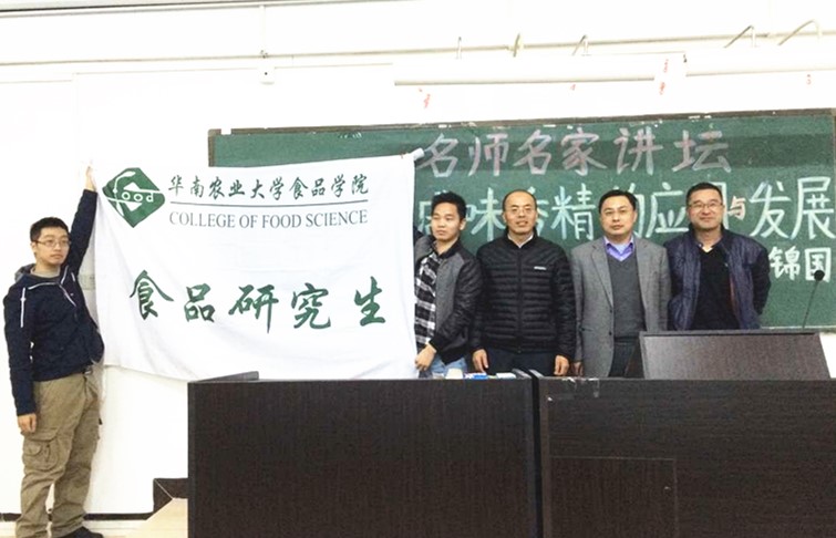 华栋调味品公司技术总监陈锦国正专注讲解 作为国内知名的咸味香精企业华栋调味品公司的技术总监,陈总以咸味香精的发展历程开篇,从膨化食品、方便食品、家庭调味料、快餐等五个不同行业分别详细介绍了咸味香精香料在国内外食品行业的应用概况。让同学们全面了解了这一行业的历史与现状,讲座中,陈总通过列举实例结合“样本”解说了香精香料行业的重大事件,特别强调了香精香料应用的广泛性与商业价值,一方面为食品学子在这一行业发展研究提供参考,另一方面也警醒了在座听众择食应从健康出发。 与会嘉宾集体留影 此次讲座为学生展现了咸味香精香料的发展应用状况及存在问题。有助于学生跳出局限、拓宽视野,讲座的顺利结束宣告了第十届食品科技文化节的圆满落幕。 (图/文 食品学院团总支宣传部李雄/刘运花 李雄)
