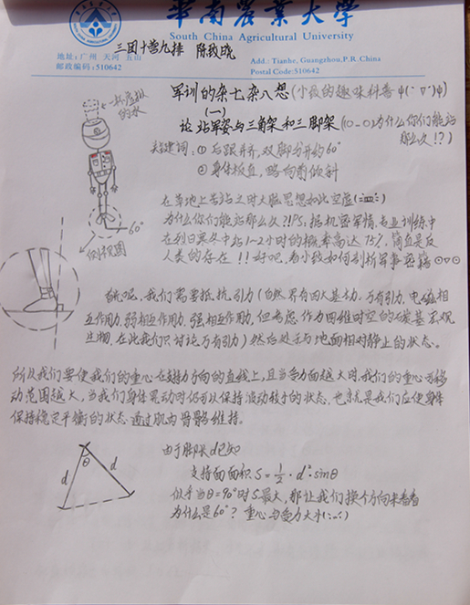 一个星期的军训生活过去了,在经历过射击、地形学、消防演练、擒敌拳等多项训练之后,别出心裁的学员们拿出手中的笔纸画出心中的声音。三团十营九排陈致晓的作品《论站军姿与三角架和三脚架》,用一种包含数理化生四科知识理论的独特视角,图文并茂地诠释了她所认识的“站军姿”。“因为我觉得自己感思稿写得不好,还不如画一些自己喜欢的东西。加上在军训定住不能动时,大脑就开始胡思乱想,比如为什么我们要站成那样?手的力度如何控制?有什么运动学力学原理?为什么身体那么那么难受?联系起来就是物理数学和生物化学的各种理论,瞬间觉得军训有趣多了。”陈致晓解释到。