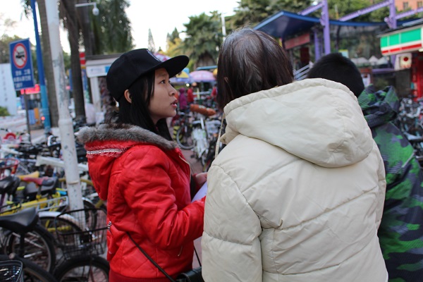 队员们决定把调查地点定在天河区粤汉路,并在下午进行采访。由于天气寒冷,且正值上班时间,路上行人不多。有些路人听说是调查问卷就扭头走开,并不愿意接受采访调查。队员们并没有因此失去热情,继续另寻路人进行采访调查。皇天不负有心人,还是有热心的市民愿意花些许时间配合粥依因小分队完成采访调查。与荔湾区的居民有所不同的是,天河区的居民对于艇仔粥似乎并没有那么热爱,甚至一些外来工作者或者大学生根本不认识艇仔粥。队员们认为这是关乎艇仔粥发展前景的一大难题。