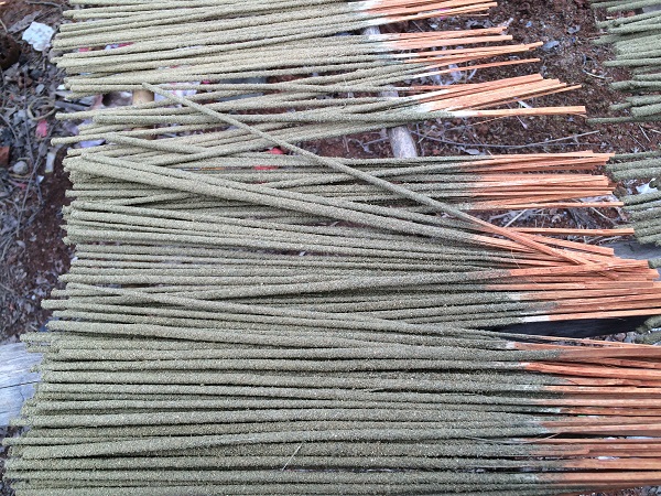 在调研途中,湘香油茶队偶遇会用茶籽壳制香的八旬老人,并请老人现场制作了一批香。老人介绍道,他制作的香一般卖给信仰佛教的素食群体,分为天香跟普通的香两种。普通的香80支才卖2.5元,因为价格便宜,销路一直不错,一年收入能达到2000-3000元。