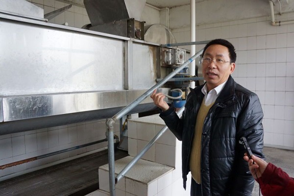 上午队员们到达后,在工作人员指引下直接前往酒厂的工作车间进行参观和学习。过江龙酒业有限公司的副总经理王平先生一路为大家详细讲解黄酒的整个现代机械化生产的流程,主要有蒸饭、冷却、拌曲、发酵、糖化、揭酿六大步骤。揭酿后的酒糟会被输送至大桶中进行发酵约15天,再抽送至压榨车间进行压榨,并将压榨后的酒液抽至炙烧处采用柴火炙烧,炙烧过程能蒸发出部分酒精,有助于降低酒精度数。