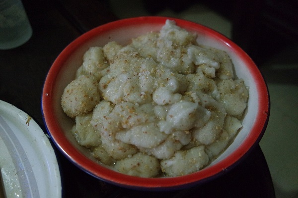 其实“落汤钱”长得很像梅州的一种小吃,糍粑,但是却比糍粑更甜。它采用糯米和花生糖作为原料,口感柔润如棉,蘸了花生糖屑之后放进嘴里慢慢咀嚼,花生的香脆与糯米的香甜让人欲罢不能。曾妈妈把糯米捏成一个个形如铜钱的扁平小圆团,放进开水锅中煮,水开的时候,糯米团浮上水面,仿佛一个个小铜钱落在了汤水里,队员们这时候才对“落汤钱”名字的缘由恍然大悟。潮汕人民不仅懂吃,在起名字的时候也十分传神到位,‘落汤钱’这三个字很传神地道出了该小食的样子、做法,而且用潮汕话读起来铿锵响亮,寓意吉祥。