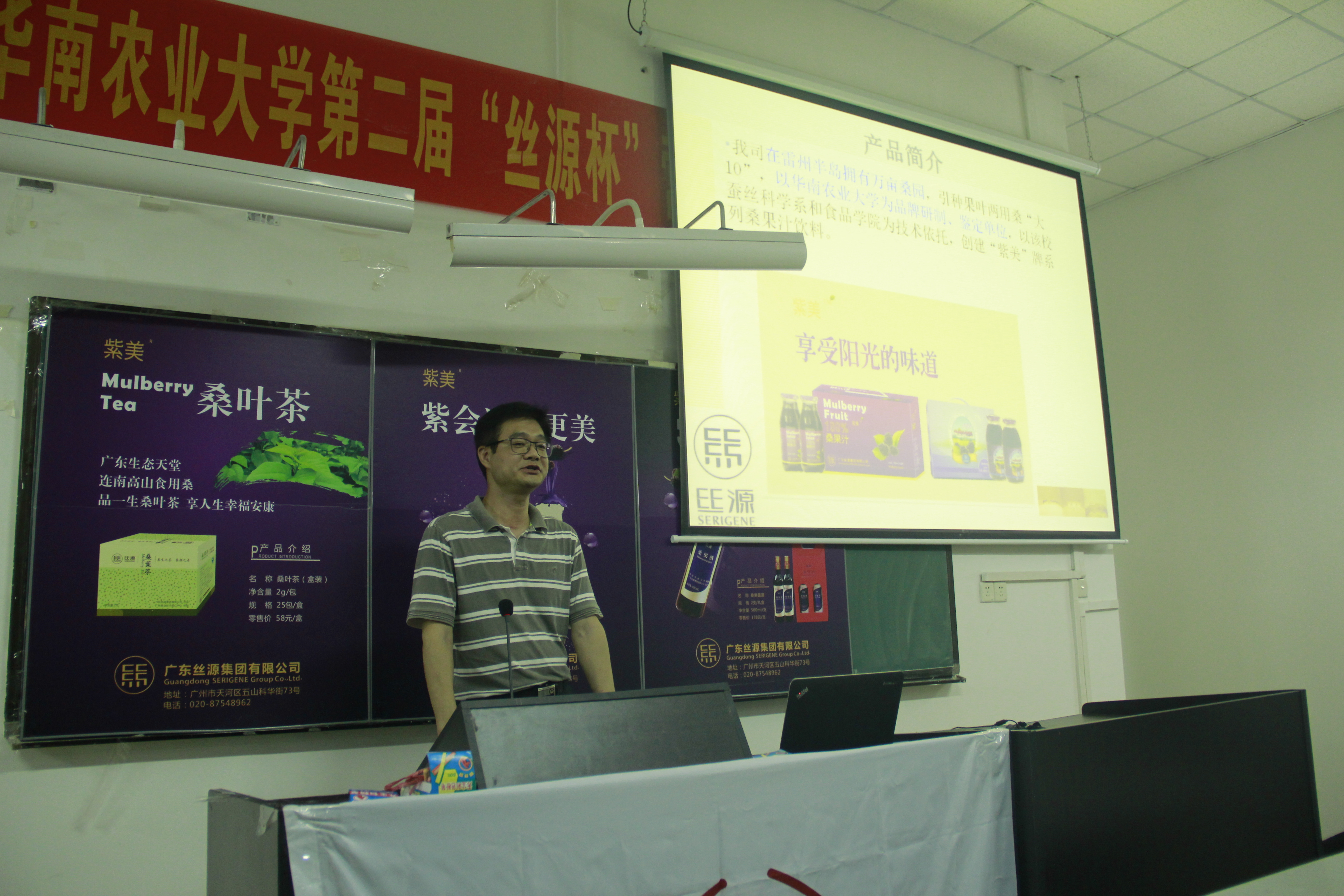 启动仪式上,我校创新创业导师、广东丝源集团有限公司总经理助理陈列辉先生简要介绍了广东丝源集团的辉煌历史和发展现状,重点介绍了桑果汁、桑果酒、桑果干和桑叶茶等系列健康产品的营养功效和制作原理,传授了销售秘诀,并鼓励参赛队员们继续努力,取得好成绩。
