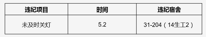 本周纪检日有少数宿舍未能按时关灯。大部分同学们能较好自觉遵守学院规章制度,并且希望同学们都能做得更好。