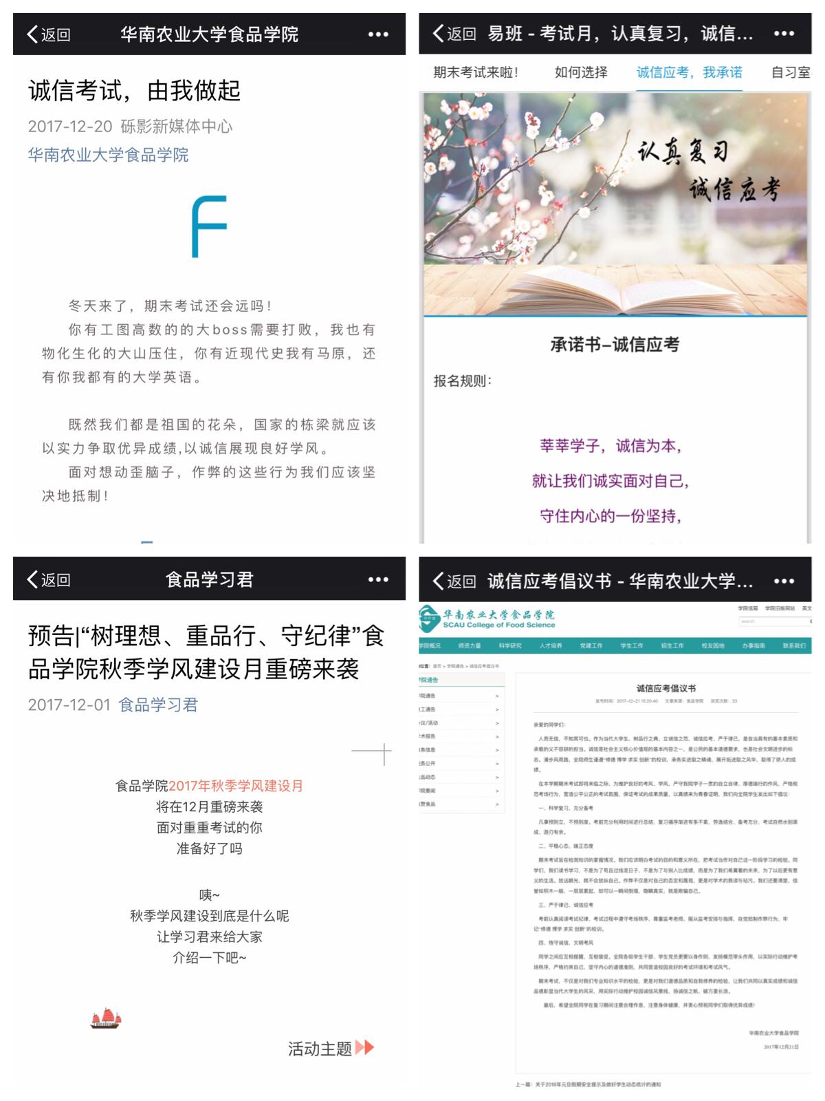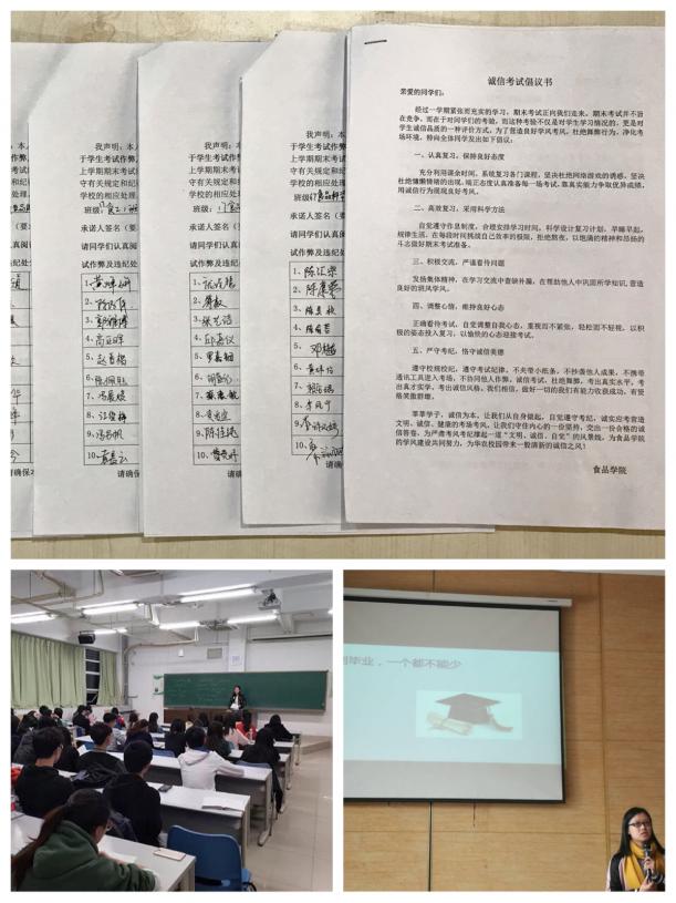 线上院通过微信公众平台、易班平台和学院网站,进行了诚信考试的专题宣传动员,号召全体学生认真复习、严守考纪线下推进开展了食品学院学风建设月活动,包括新生模拟考、导生帮扶计划、课堂笔记大赛、学风评比等活动,使学生在学习和承诺中进一步强化诚信考试意识促进良好学风的形成。