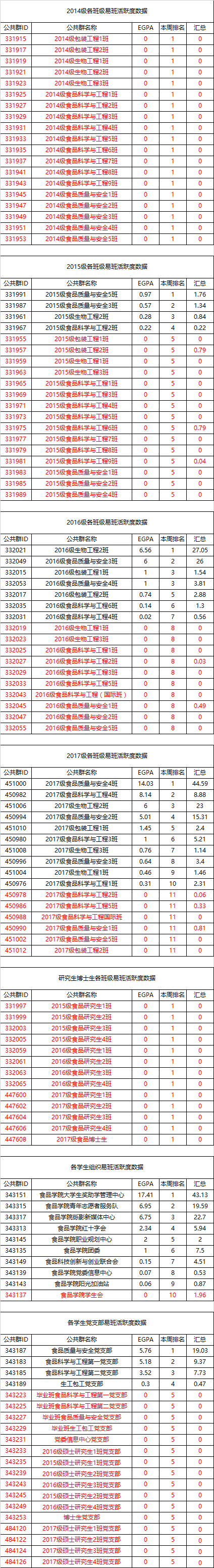 以上数据更新于2018年4月1日,标注为红色的是本周活跃度为零及以下的班级、组织和党支部,请负责人积极引导班级、组织或支部成员使用好易班,继续做好“易班+学生工作”。如对学院易班工作有更好的建议请与左浪老师联系,电话:85280265。