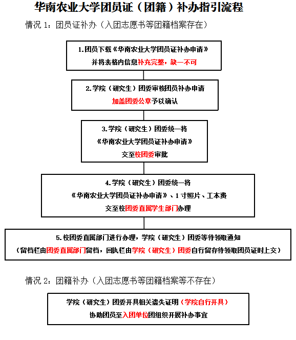 团员填写《华南农业大学团员证补办申请》后,交由学院团委统一递交至校团委,经组织审议后为其办理团员证补发手续。补发的团员证不再使用原团员证号码,其编号另行补编,并收取一定的工本费。