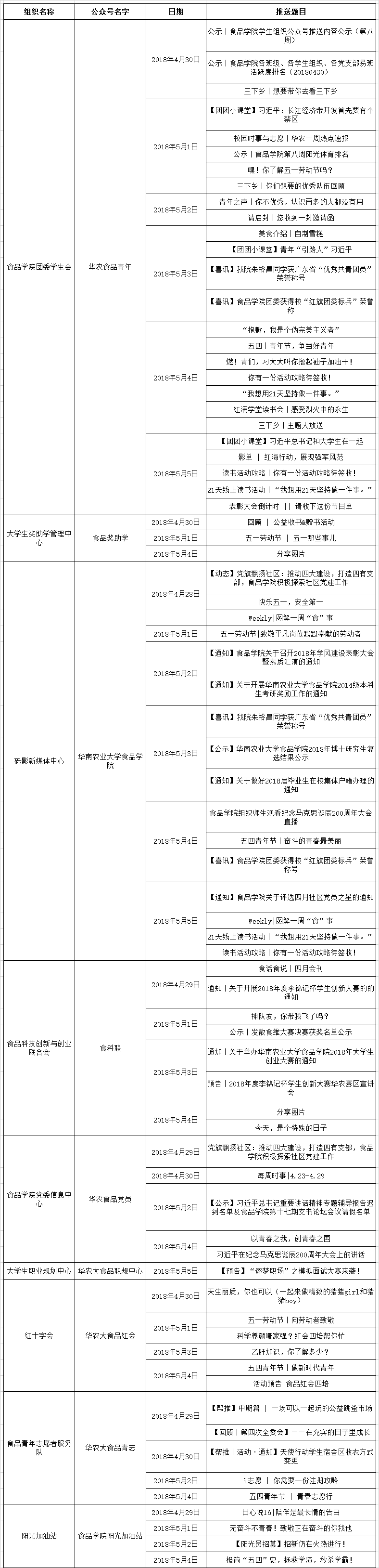 为认真落实学校共青团改革实施方案的要求,切实加强和改进我院共青团各项工作和建设,统筹推进上下联动。坚定不移推进共青团改革攻坚挺向纵深,全面加强从严治团,有效提升基层团组织的活力和战斗力,为使学院师生更加清楚地了解我院各学生组织每周的活动开展和宣传情况,现将我院各学生组织公众号的推文内容进行公示,公示如下: