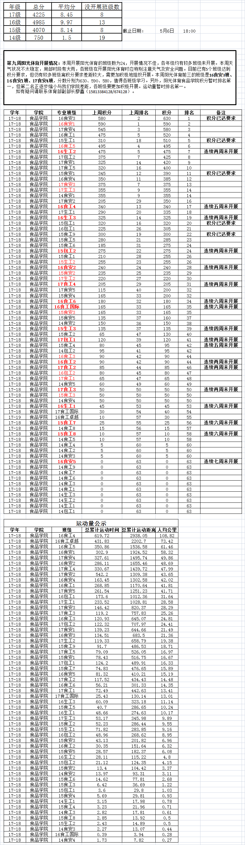 第九周阳光体育开展情况:本周开展阳光体育的班级数为24,开展情况不佳,各年级均有较多班级未开展。本周天气状况不太稳定,局部时段有大雨,各班级在开展阳光体育时应特别注意天气及安全问题。目前已有5个班级达到积分要求,但仍有较多班级离积分要求差距较大,需更加积极地组织开展。本周阳光体育前三的班级是16食安3班、16食安1班、17食安4班,分数分别为630、590、580,值得各班级学习。另外,阳光体育食品学院积分暂时排名第一,但第二名正逐步缩小与我们学院差距,各班级要更加积极开展。运动量暂时排名第一。