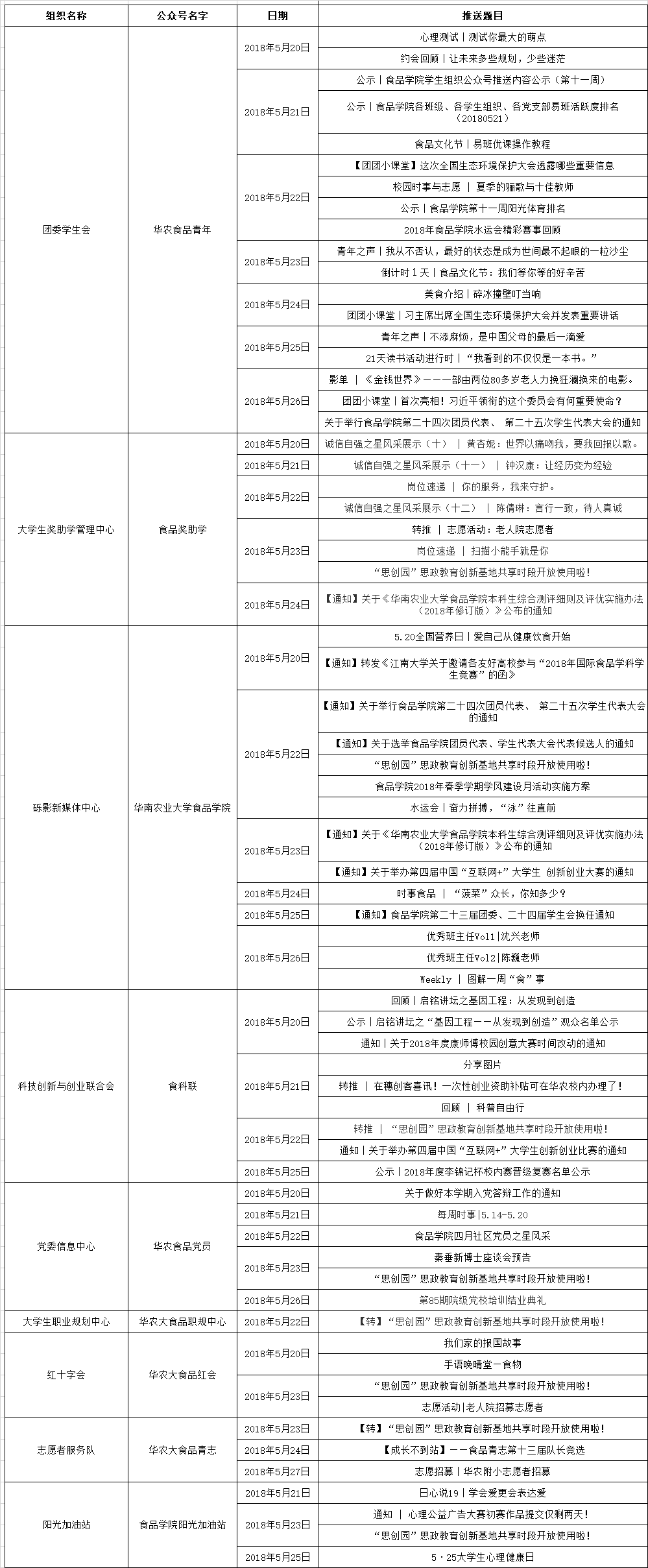 为认真落实学校共青团改革实施方案的要求,切实加强和改进我院共青团各项工作和建设,统筹推进上下联动。坚定不移推进共青团改革攻坚挺向纵深,全面加强从严治团,有效提升基层团组织的活力和战斗力,为使学院师生更加清楚地了解我院各学生组织每周的活动开展和宣传情况,现将我院各学生组织公众号的推文内容进行公示,公示如下: