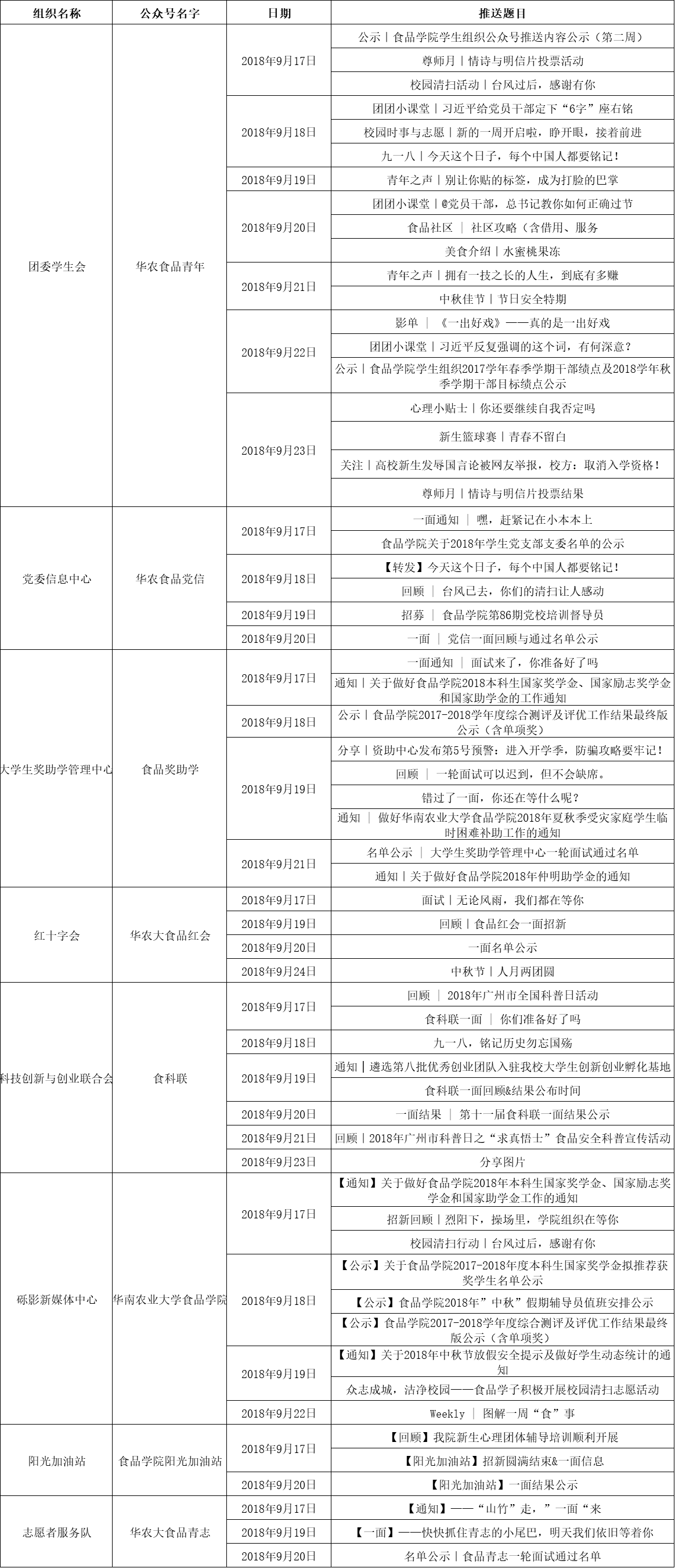 为认真落实学校共青团改革实施方案的要求,切实加强和改进我院共青团各项工作和建设,统筹推进上下联动。坚定不移推进共青团改革攻坚挺向纵深,全面加强从严治团,有效提升基层团组织的活力和战斗力,为使学院师生更加清楚地了解我院各学生组织每周的活动开展和宣传情况,现将我院各学生组织公众号的推文内容进行公示,公示如下: